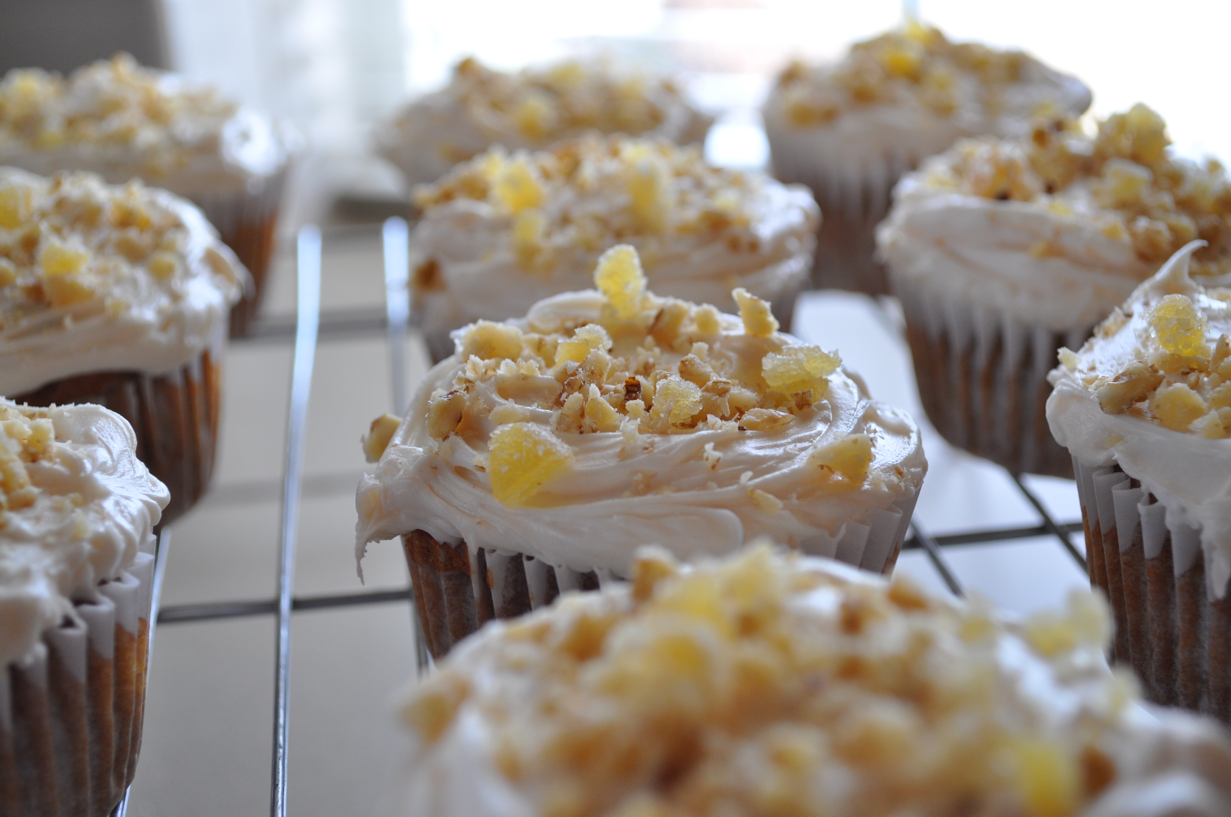 Frost with your choice of frosting and sprinkle lightly with walnuts and crystallized ginger. A little bit of ginger goes a long way, so remember to just sprinkle a tiny amount on each cake.