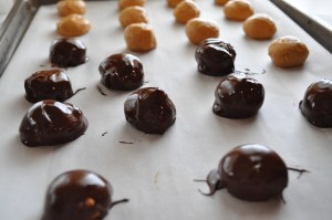 Working quickly, use a dinner fork and a serving fork to carefully place peanut butter balls in chocolate until coated. Allow excess to drip off. I like to use forks instead of teaspoons because the forks allow excess chocolate to drip through the tines. It’s a messy job no matter how you do it.