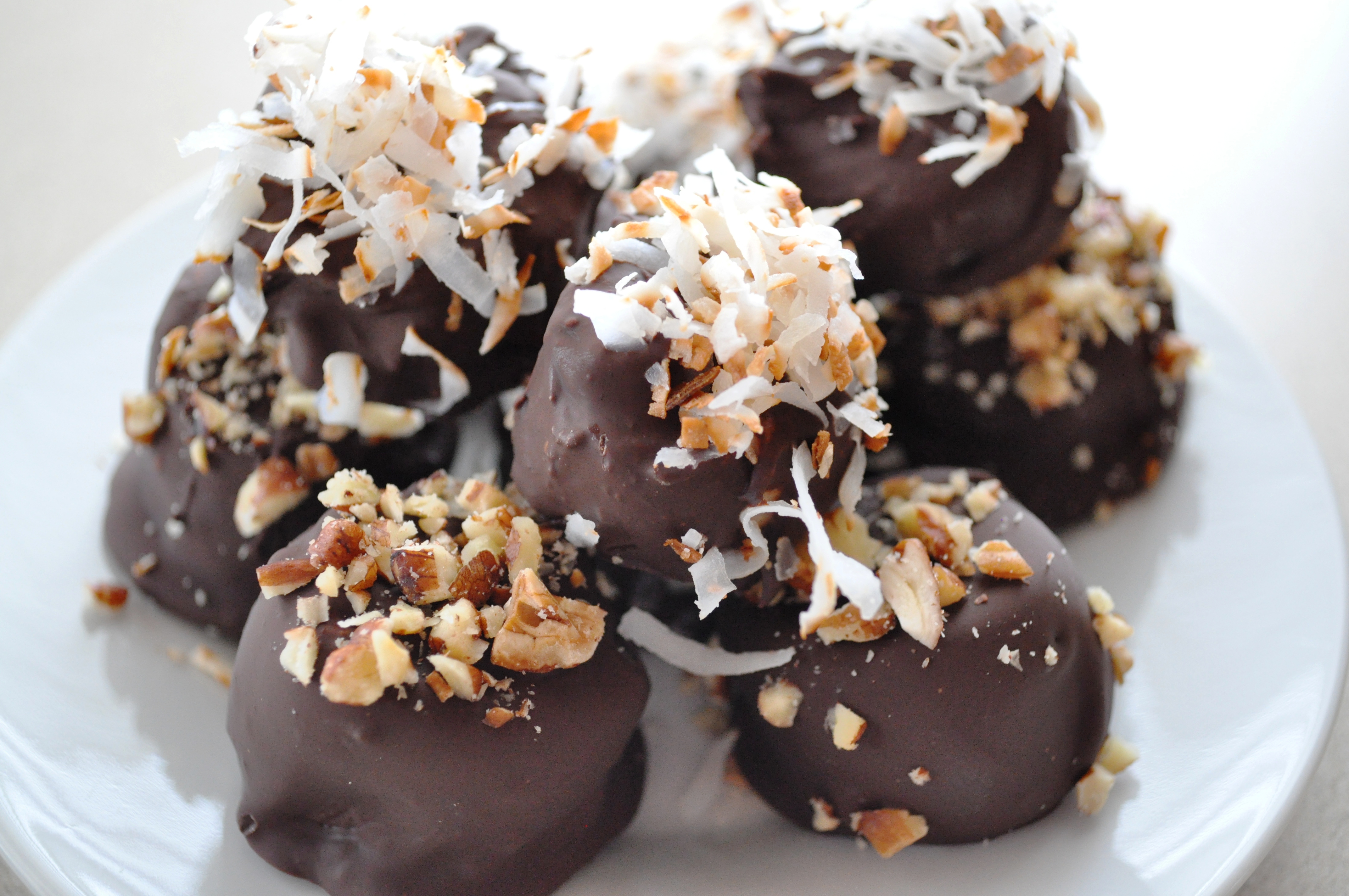 Freeze for 30 minutes. Toward the end of the freezing time, chop the nuts and toast the coconuts, set aside. Place chocolate in a double-broiler and melt, stirring until smooth.