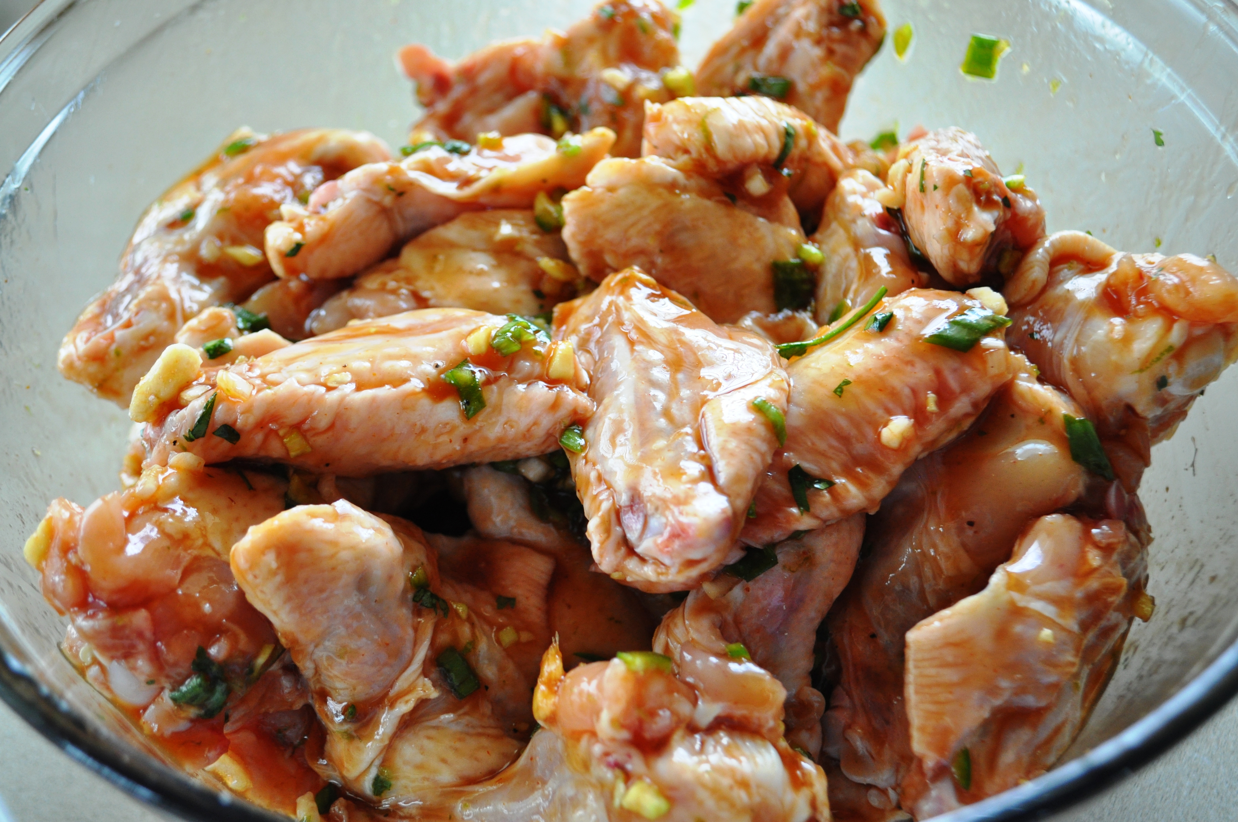 Preheat oven to 350Β°. Line a baking sheet with alluminum foil. Place chicken wings in rows and drizzle with remaining marinade.