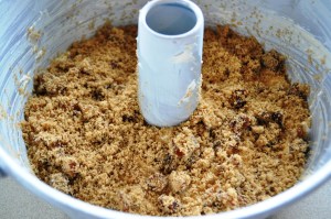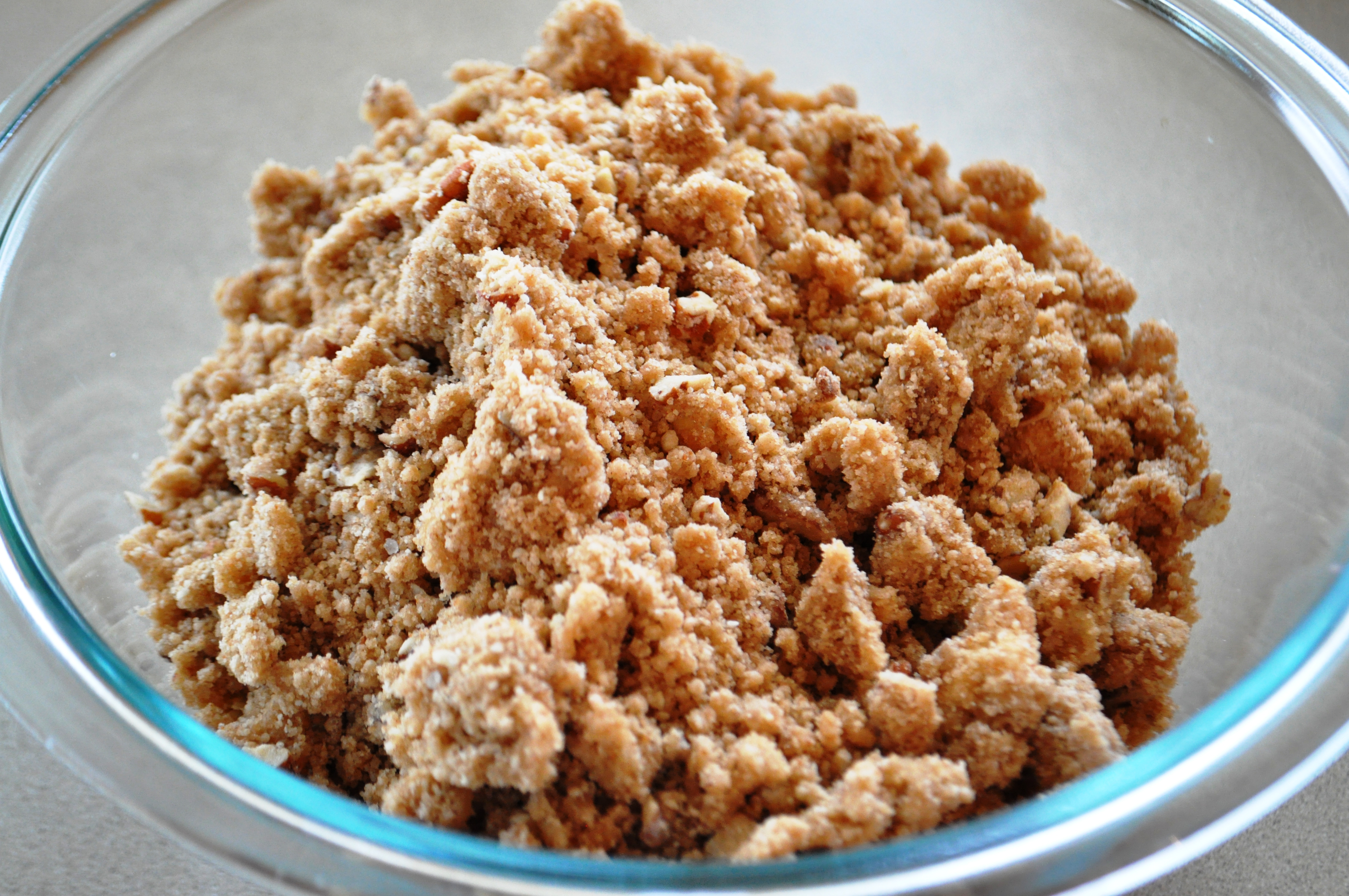 1. Make the streusel topping: Mix together 1 3/4 cup flour, 3/4 cup brown sugar, 1 tsp. cinnamon, and 1 tsp. course salt, and 1/2 cup nuts. Cut in the butter using a pastry cutter or gently rub through with your fingers until small to medium clumps form. Refrigerate until ready to use.