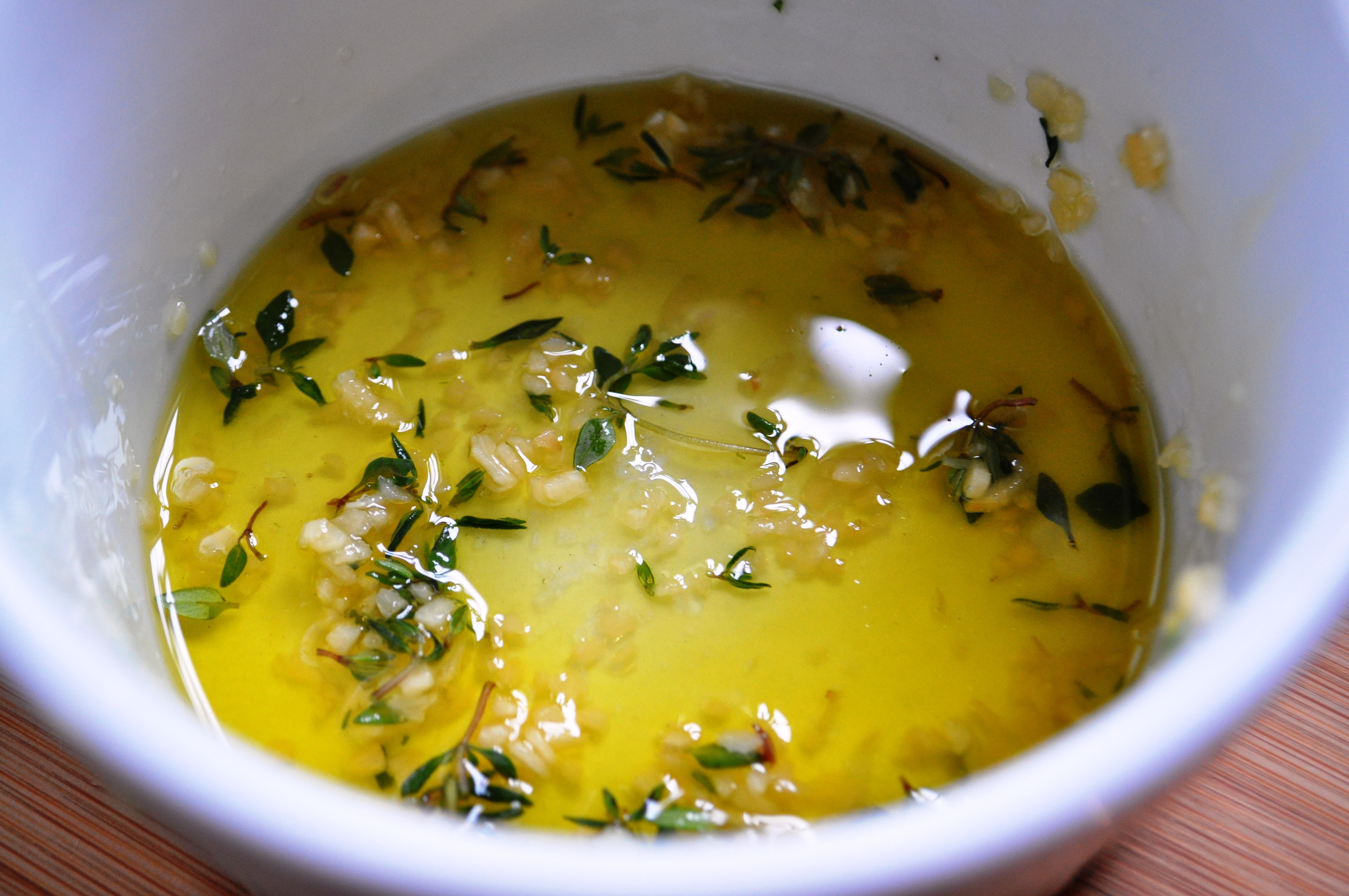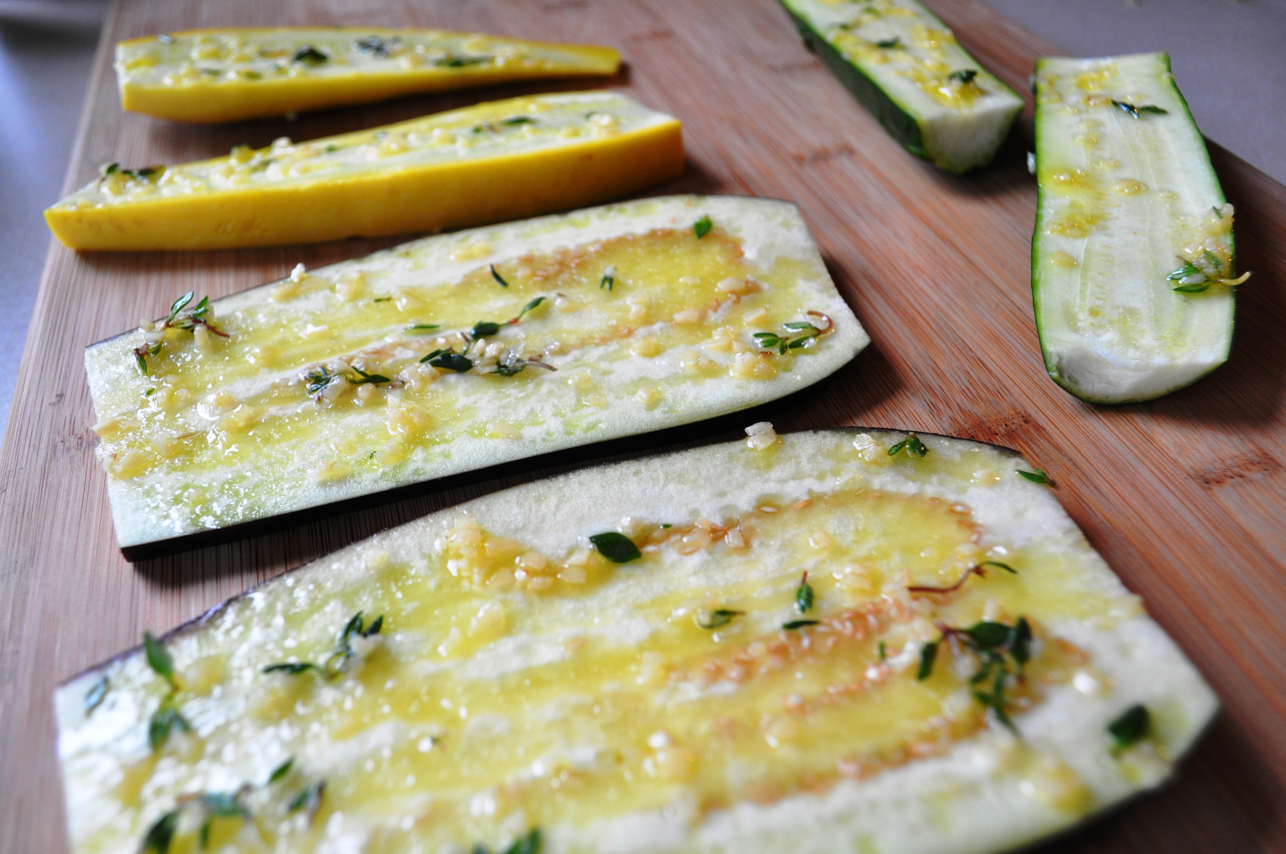 Slice the eggplant, the yellow squash, and the zucchini squash, lengthwise. About 1/2 inch thick or so. In a ramekin, stir together the olive oil, garlic, thyme leaves, and sea salt.