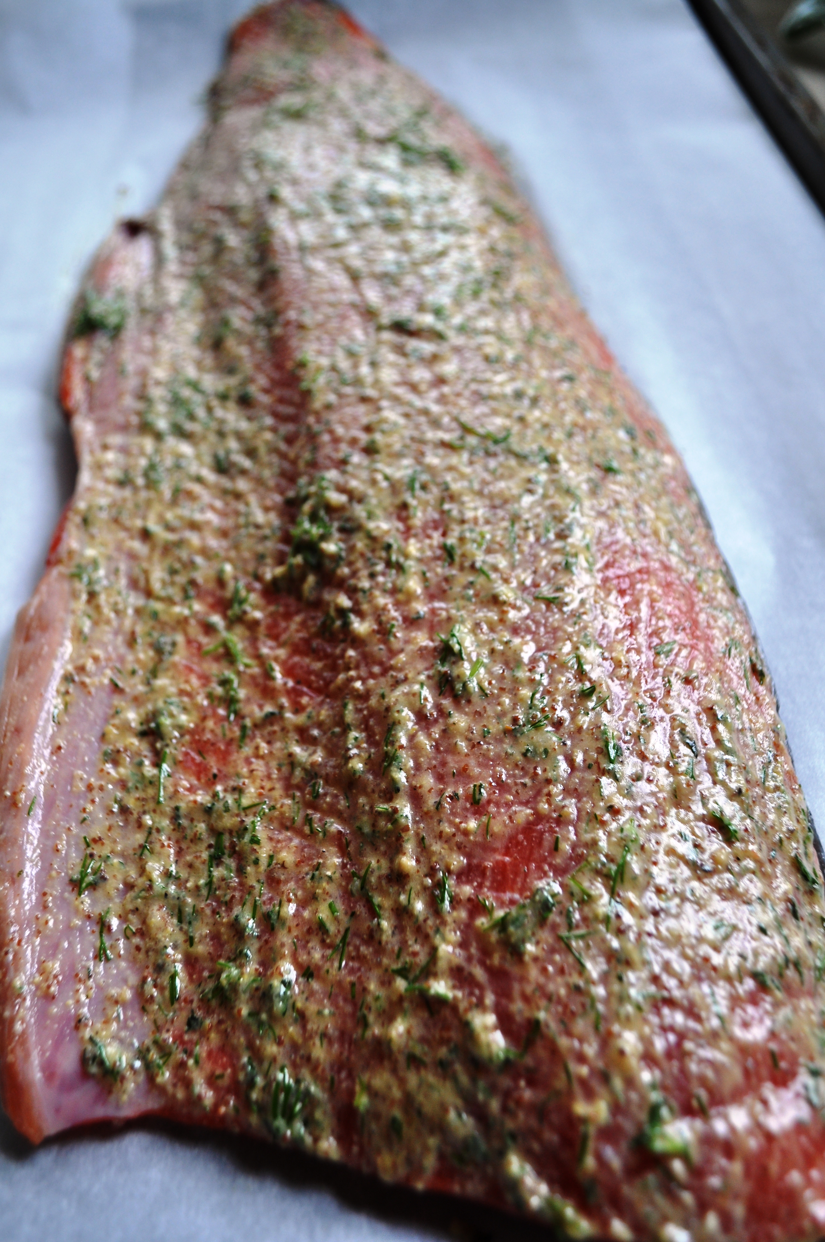 Place side of salmon on a parchment covered baking sheet. Pat dry. In a ramekin, mix together the olive oil, Dijon, salt, pepper, garlic, and dill. Spread on salmon. Set Aside.