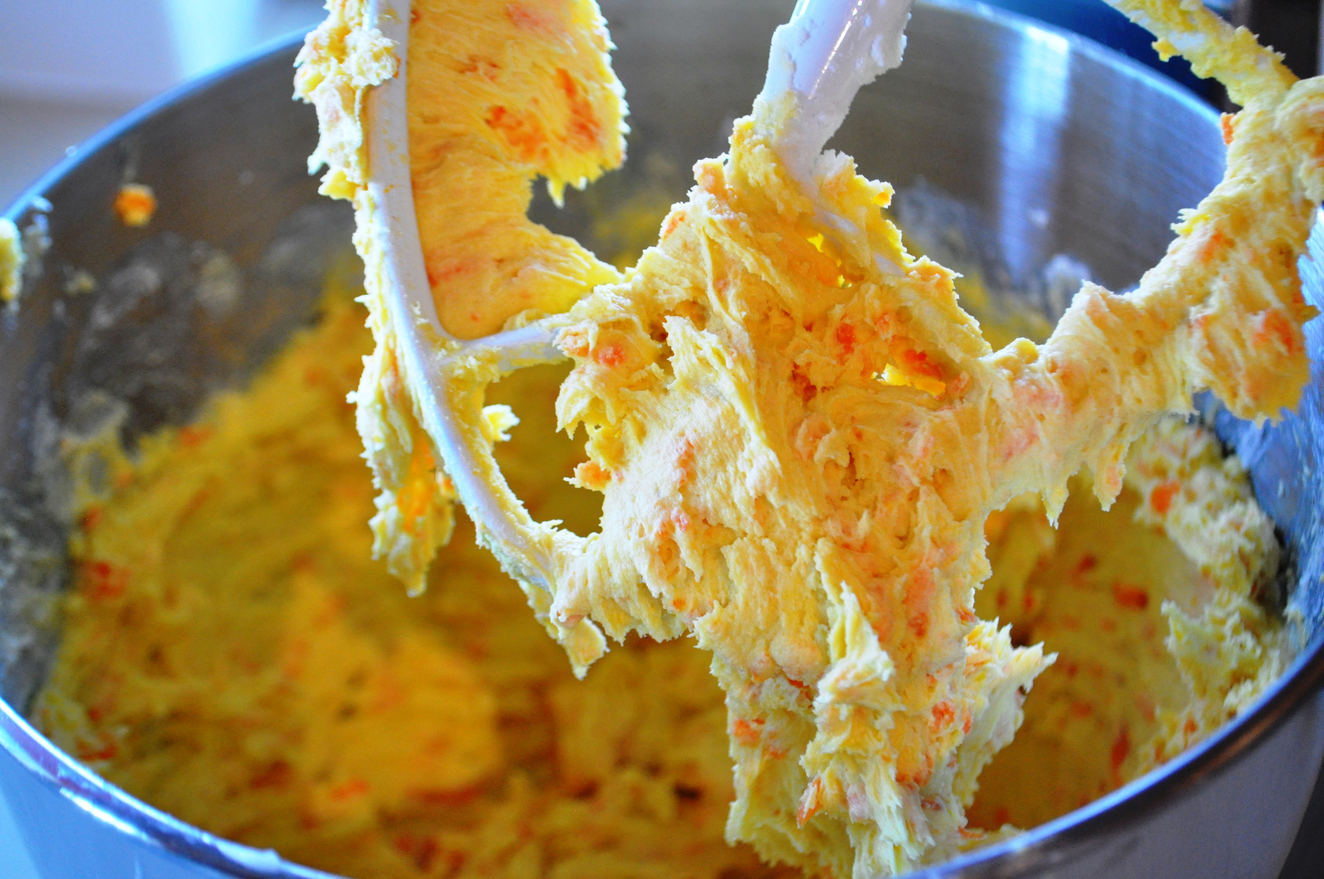 Whisk flour, baking powder, salt, and xanthan gum in a medium bowl and set aside. In a mixer cream the shortening and sugar scraping down the sides once or twice. Â Add Carrots, rind, juice, and egg. Mix until thoroughly combined. It will be a gorgeous orange color.