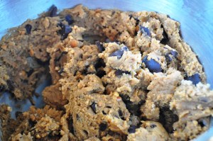 Preheat oven to 350 degrees. Line two baking sheets with parchment paper. Place all ingredients except the chocolate in a mixer. Mix just until thoroughly combined, do not over mix. This will only take maybe 10-15 seconds.