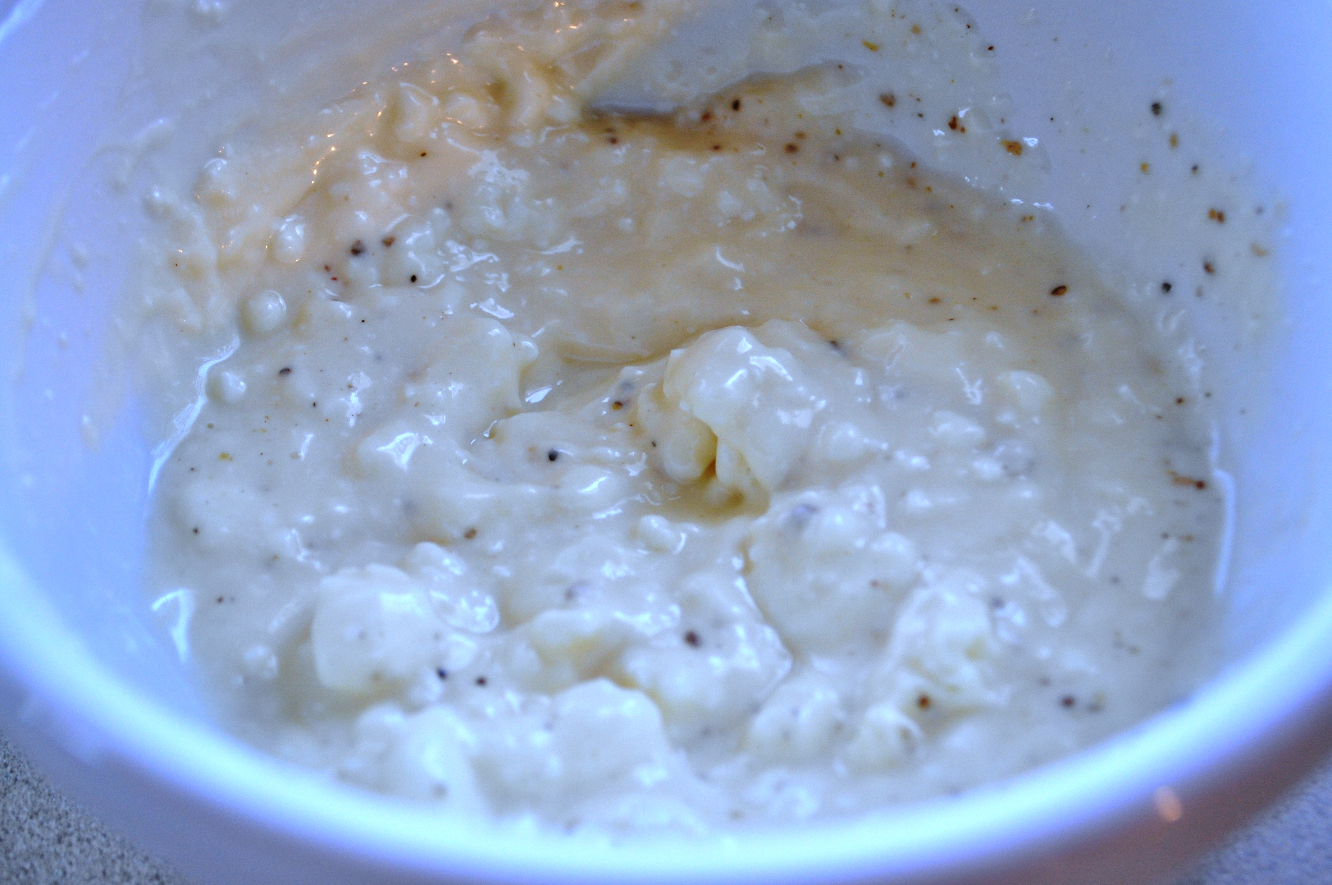I used 1 Heaping Tablespoon of Olive Oil Mayo, about 3 or 4 teaspoons of Rice Wine Vinegar, and about 1/4 Block of Sheep’s milk cheese. Put it all in a bowl, seasoned with pepper and stirred with a fork until combined.