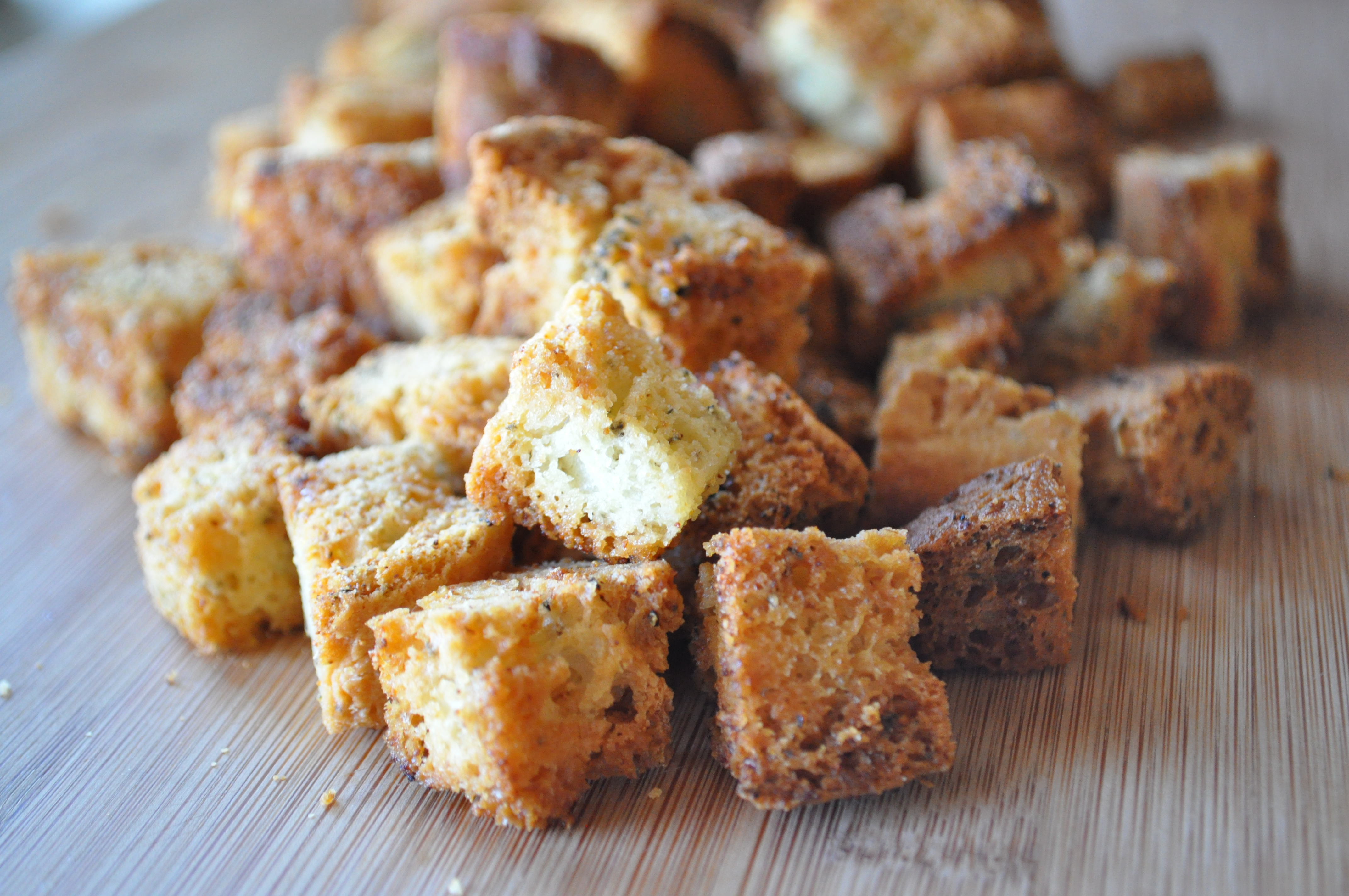 Place cubes in bowl and drizzle with olive oil, sea salt, and seasonings and toss. (My bread was already seasoned with garlic and Italian herbs but I added more garlic powder and sea salt, then tossed with oil.) Pour out onto the covered baking sheet and bake for about 30 minutes, turning once, until they are golden brown and crispy. Store in a plastic zipper bag or airtight container once they have cooled completely.