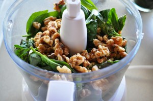 Fill your food processor up with fresh basil (I usually use 3 big boxes from Trader Joes)