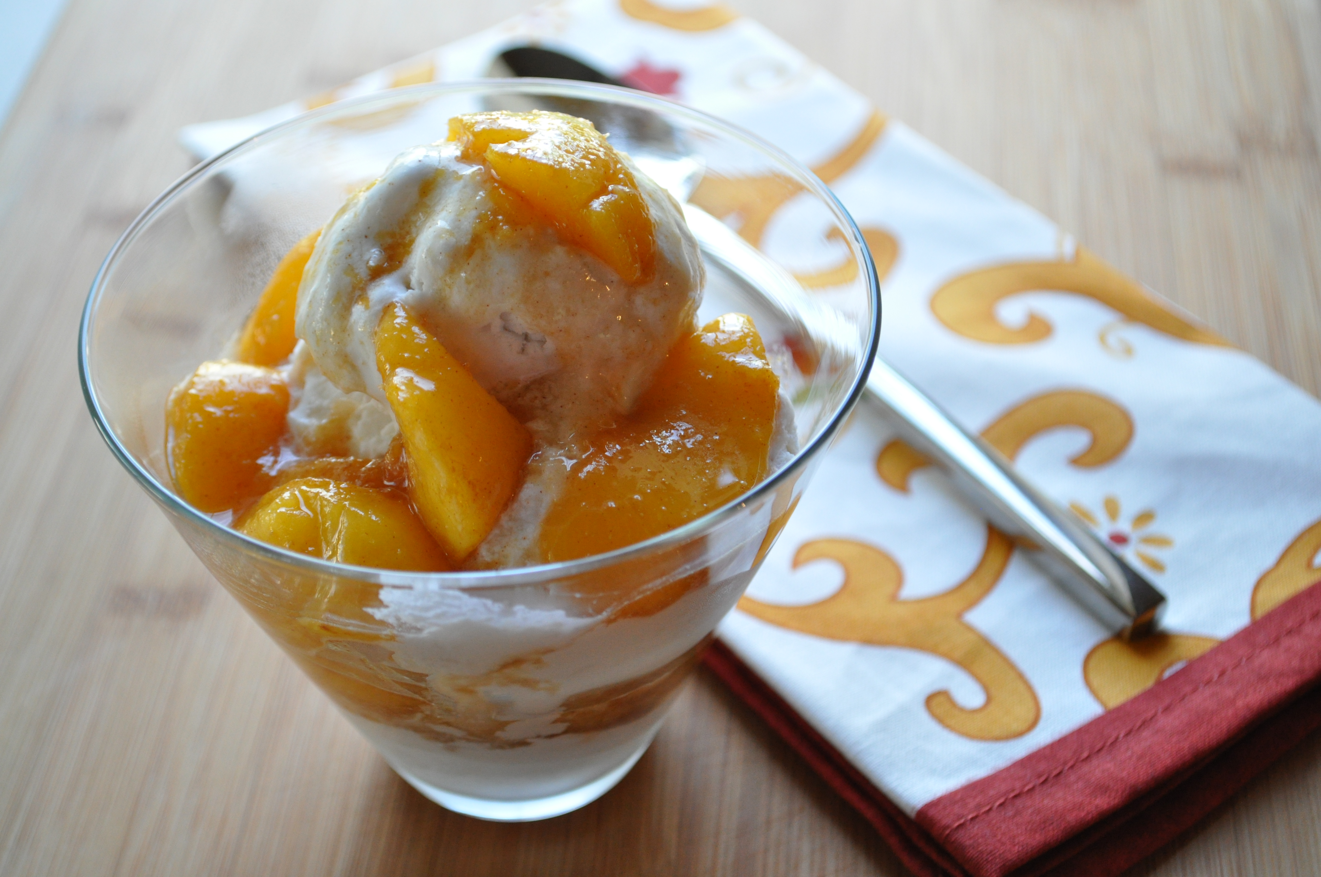 Remove from burner and cool for about 5 minutes. Drizzle sauce and peaches over ice cream.