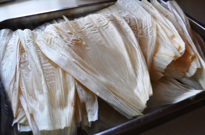 Separate the corn husks carefully and place them in a big roasting or stock pot. Cover with boiling water and allow to sit while you’re getting all of the other ingredients ready. Place a plate or dish on top of them if they keep floating to the top.