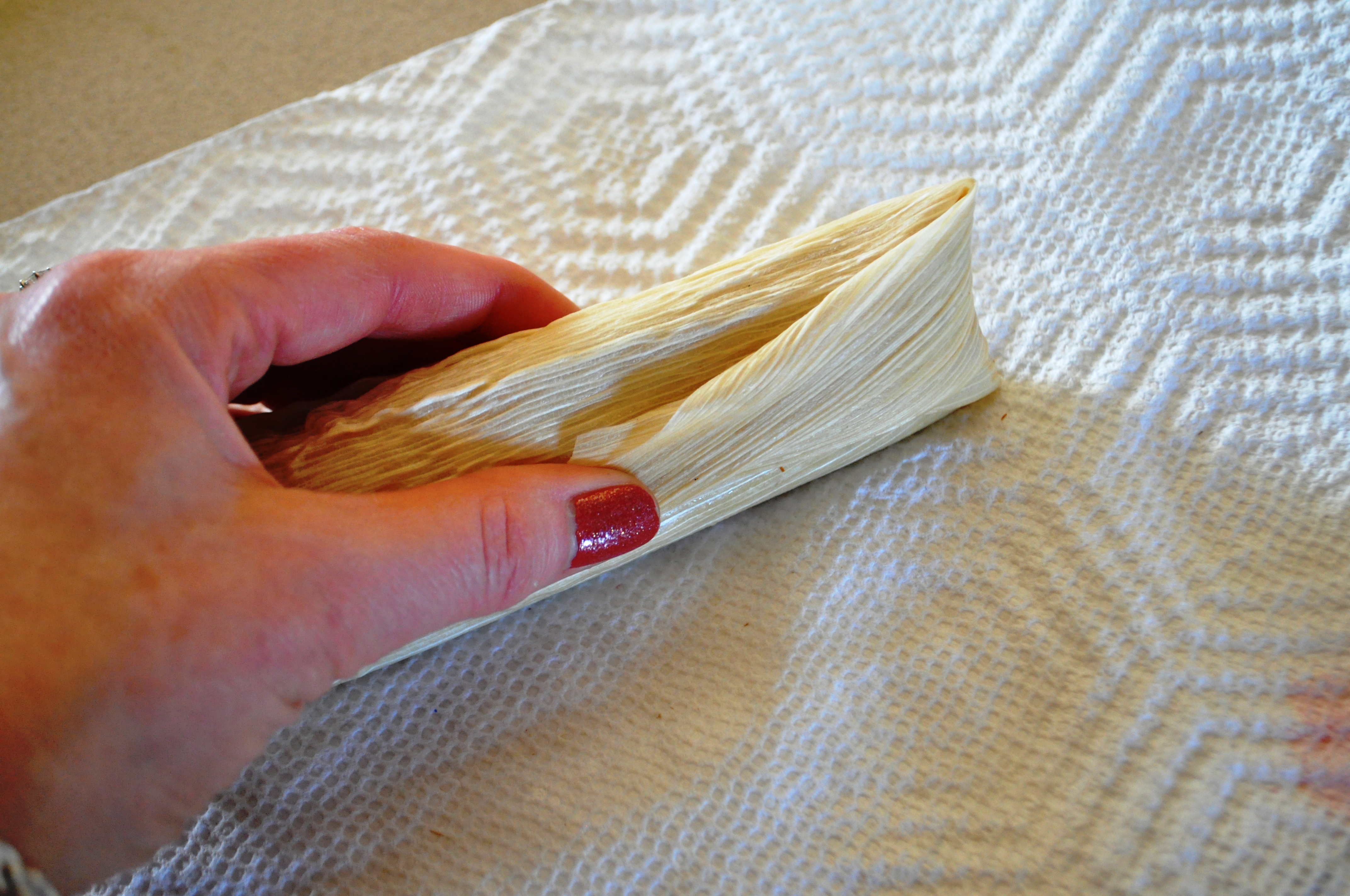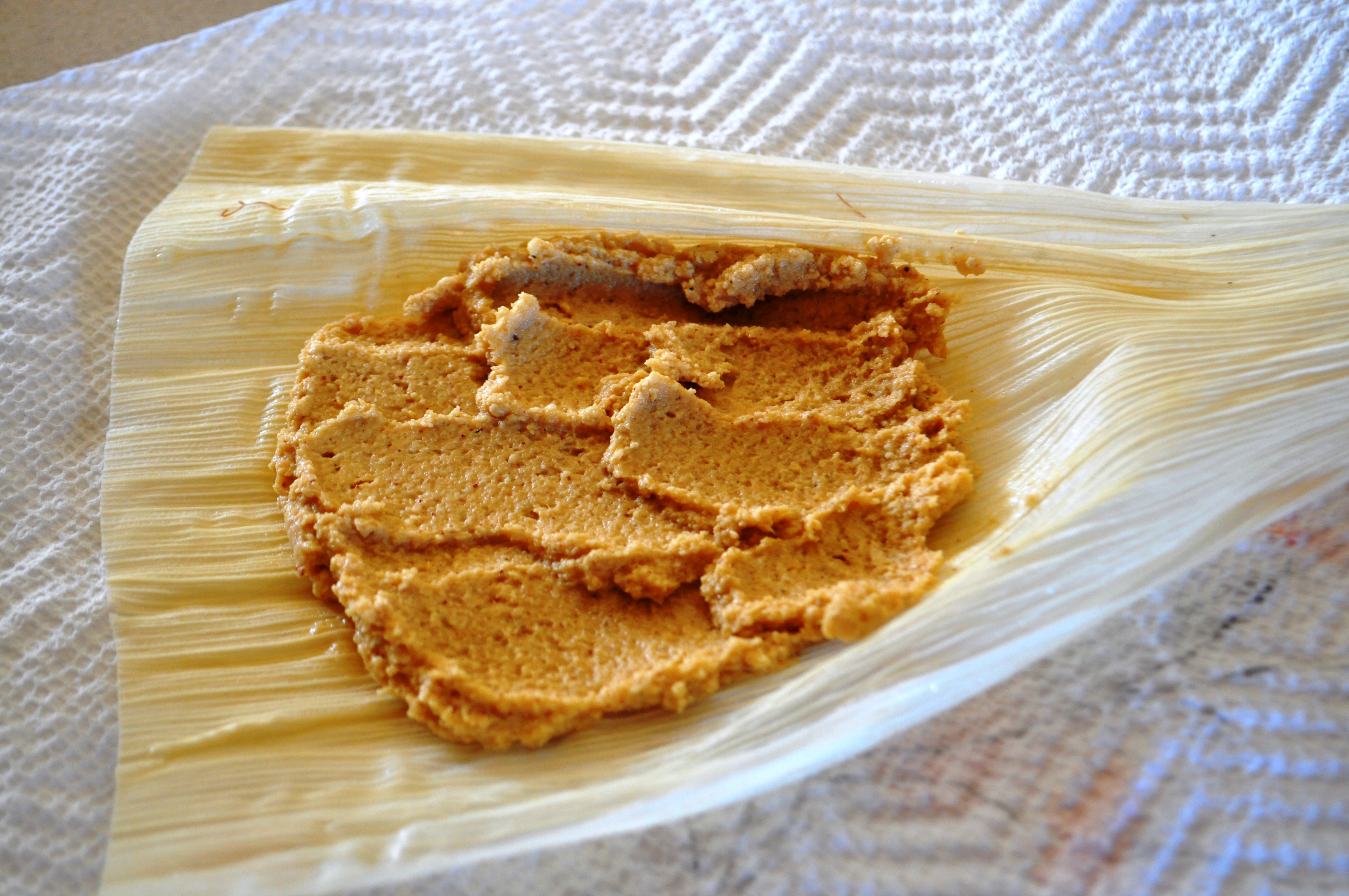 Lay a couple of paper towels out on the counter. Spread a corn husk out with the rough ridged side on the outside. Follow the picture steps below. Place a heaping Tablespoon of masa on the husk and spread.