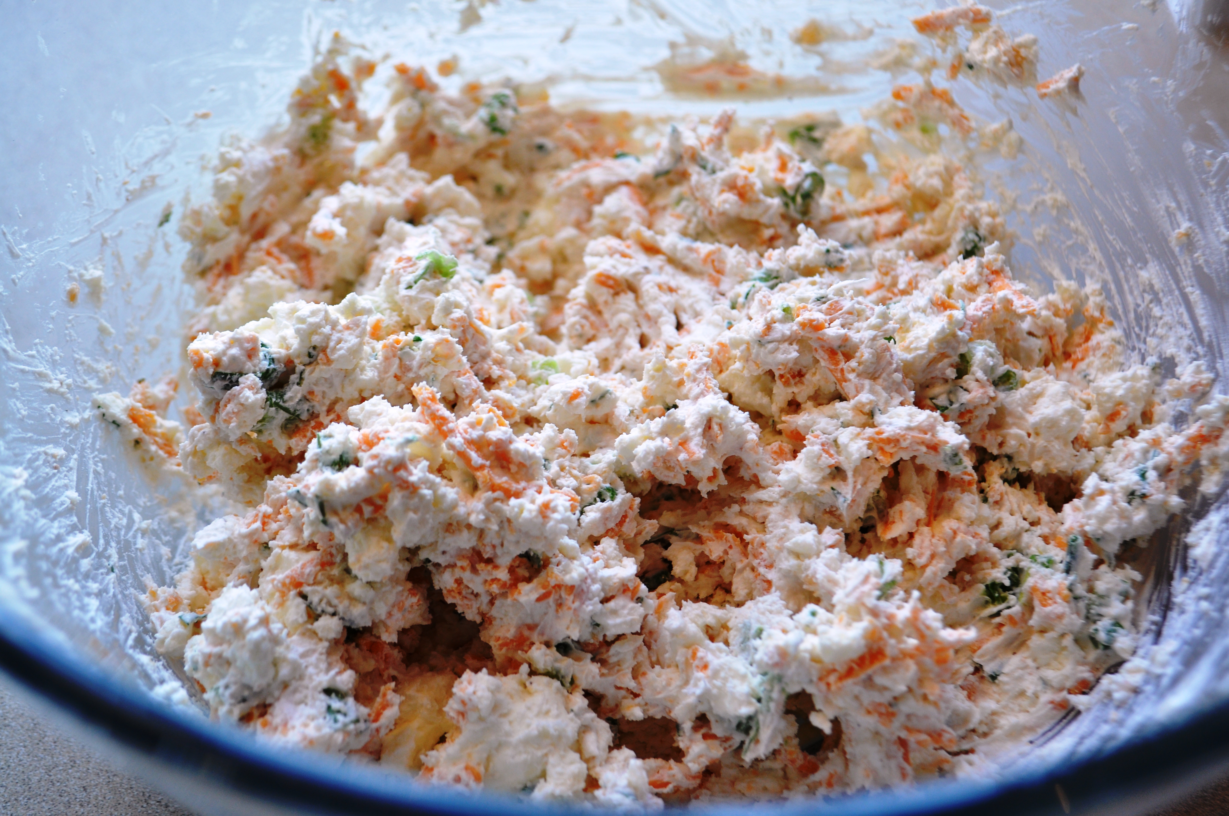 In a medium bowl, combine the goat’s cheese, dairy free cream cheese, dairy free cheddar, cilantro, green onions, garlic, and salt and pepper.