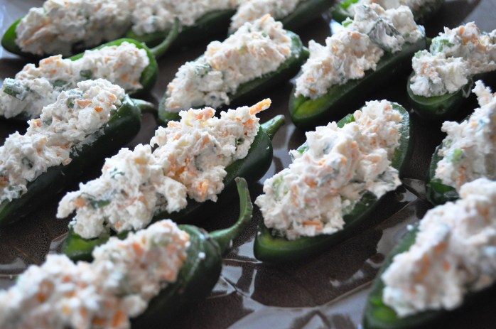 I made two versions of these. One dairy free and one with dairy. I had never made a dairy-free version and I have to admit, I was shocked at how delicious they were! So good. So good in fact that I can’t wait to make them again for the next gathering we have. For this dish, I made the cheese stuffing and cleaned the peppers two days ahead. One day ahead I stuffed all of the peppers, and then about a half hour prior to the beginning of the party I put them on the grill. I covered half of the grill with tin foil so as they were done I slid them over to the foil to stay warm. Then, turned the grill off, allowed them to sit while I did the shrimp, then removed them to a platter to serve.