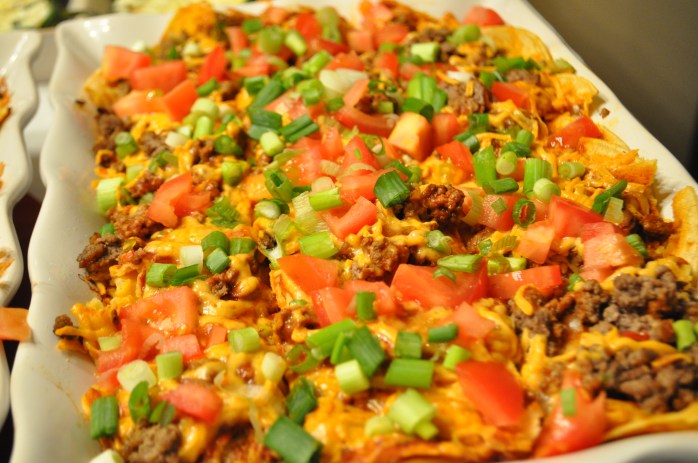 This picture doesn’t really do them justice. Trying to take pictures during a party is crazy and then figuring out the lighting and the settings on my camera…. The night before the party I sauteed the chicken, steak, peppers, and onions until the meat was cooked but rare. I refrigerated it over night and then right before the party started, I placed them back in the frying pan on medium high heat to heat through and then added the shrimp to cook.