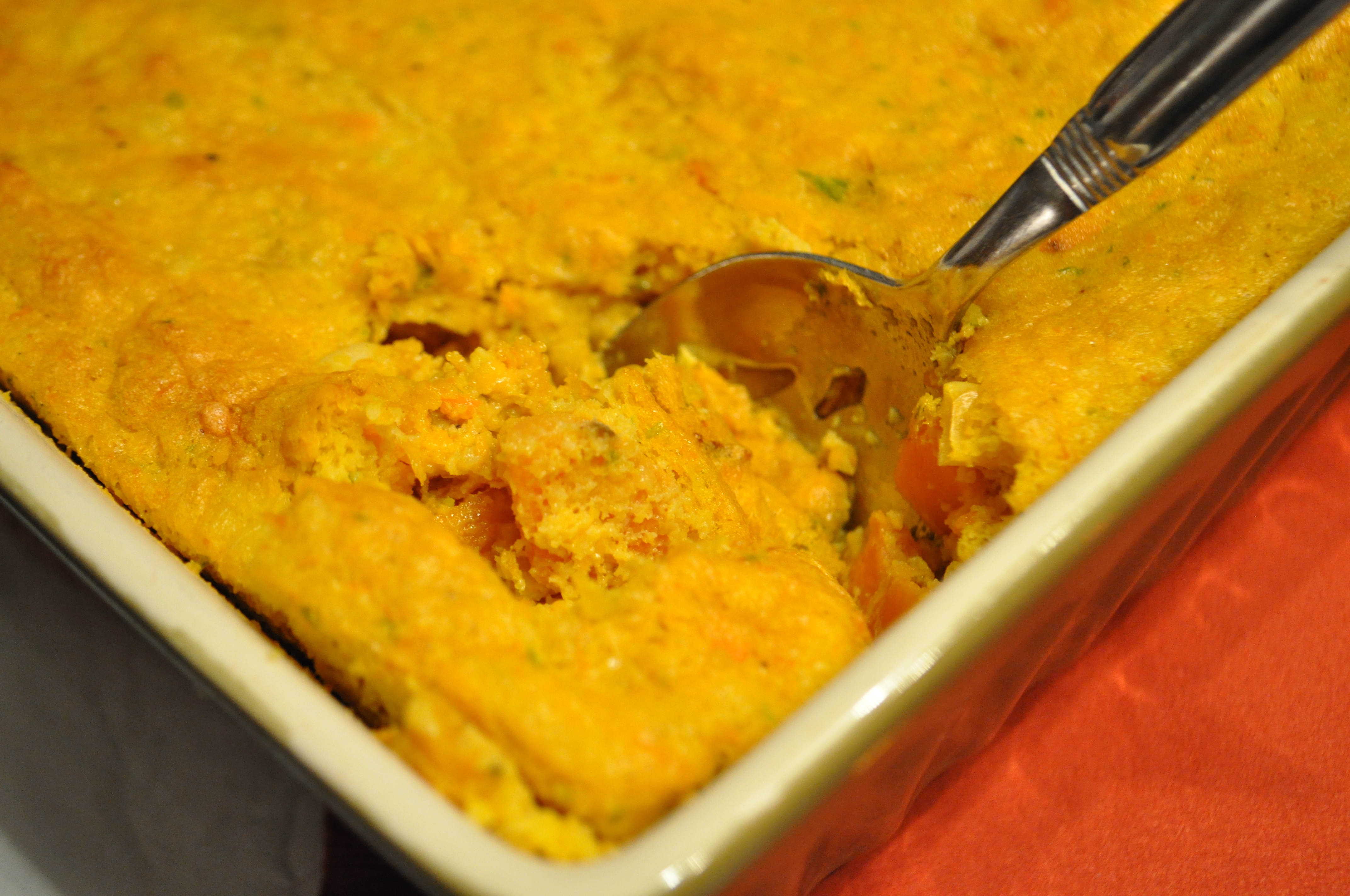 Peel and cube the sweet potato and squash, and roast until tender. Using 1 Tablespoon of the butter, grease a 9 1/2 x 11 baking dish. Put 3 Cups of the corn into a food processor, add the green onions and process until mostly smooth.