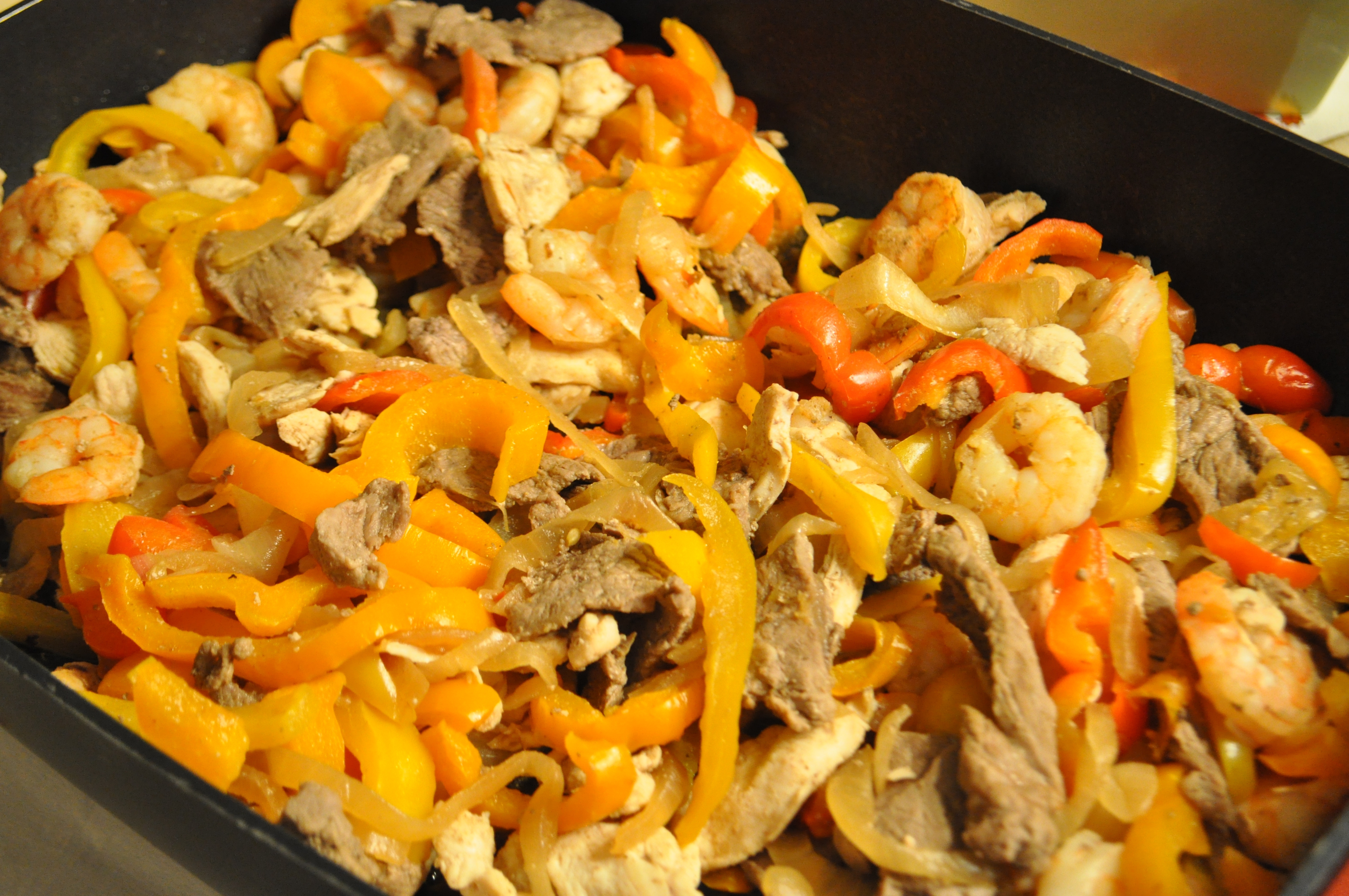 Drizzle olive oil in  large skillet. Add the chicken and steak slices, season with garlic and cumin. Saute. When the meat is rare, add the onions and peppers. When the onions are beginning to turn translucent add the shrimp and toss until done. Don’t overcook the shrimp, they become rubbery.