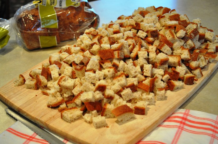 Slice and cube the gluten-free bread. The amount will depend on how many people you are serving, of course. I thought I would need three loaves but only ended up needing two.