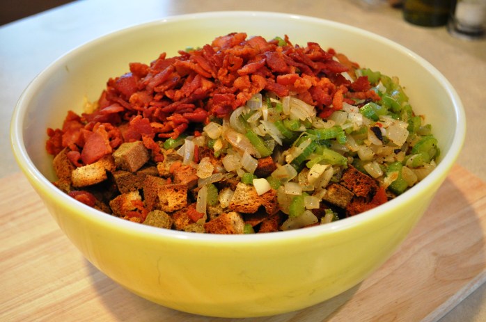 Place the toasted and seasoned bread cubes in a bowl, top with the sautéed veggies and bacon.