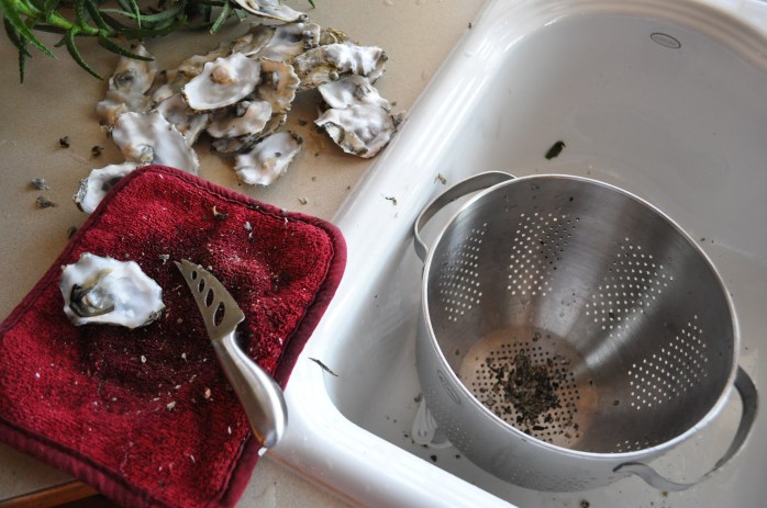 Shuck oysters being careful that no grit or shell is left with the oysters. If you don’t have a special glove, use an old oven mit to protect your hand. The fishmonger suggested I use a short flat head screwdriver to shuck the oysters but it didn’t work. You need to have a wider blade so you can twist it to pop open the shell. An over sized pocket knife would probably work just fine. You can go here to see how to shuck an oyster in 30 seconds.  I wouldn’t say that I mastered the 30 second part, but the video definitely helped. There’s a tiny hole in the fat end of the oyster. This is where you wiggle and wedge the tip of your knife. Once you get it in a little bit you can twist the knife to pop the oyster open (sometimes they give a good fight) and then work it around the edge. I wouldn’t suggest using a serrated knife like I did, it’s a little rough on the delicate edges of the oyster. I ended up having to pick a few pieces of shell out of the oysters.