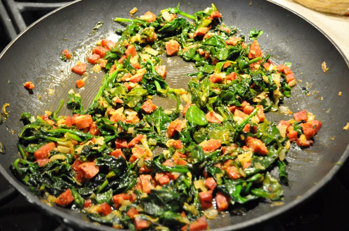 Drizzle a little olive oil in a large skillet heated to medium. Add the diced chorizo and minced shallots. Saute until shallots are tender. Add the wine and simmer uncovered until most of the wine is evaporated. Stir in spinach and cream and cook uncovered for about 10 minutes until the liquid is almost all the way absorbed. Stir in salt and pepper, remove from heat to cool.