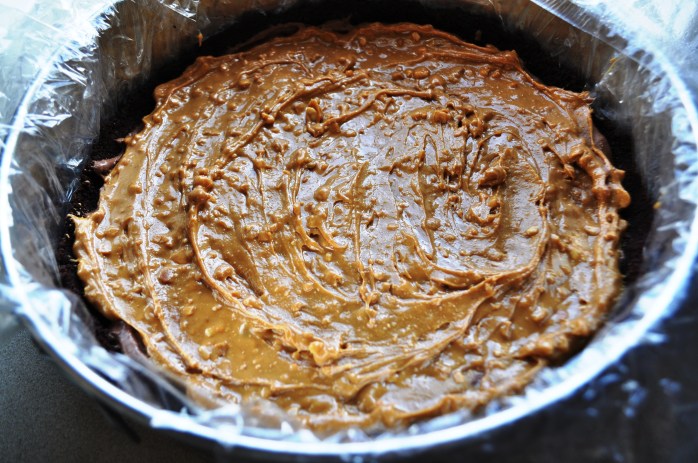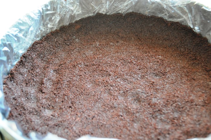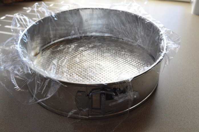 Spoon the cookie mixture into the spring form pan and with a piece of plastic wrap, press the cookies into the pan, scooting about an inch up the sides. Make sure it is firmly pressed.