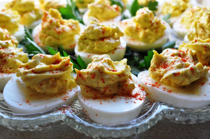 I also served steamed, organic carrots and sautéed organic green beans with garlic and wine along with the ham and twice baked potatoes. And it wouldn’t be Easter without deviled eggs as a little pre-dinner snack.
