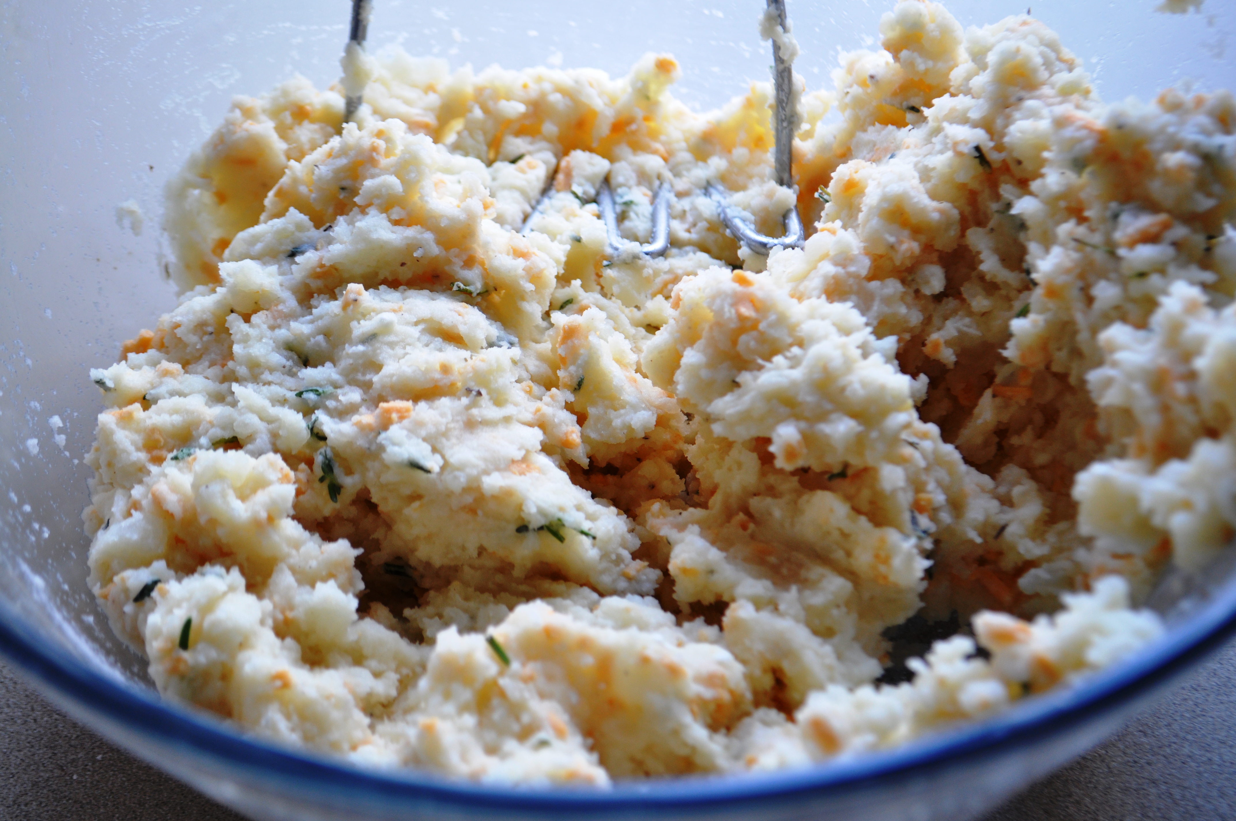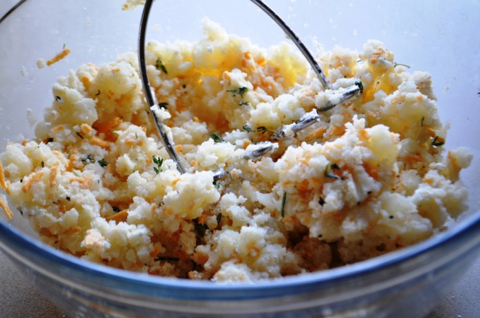 Add the cheeses, rosemary, thyme, salt, and ground pepper to the potatoes. Mash by hand until combined.