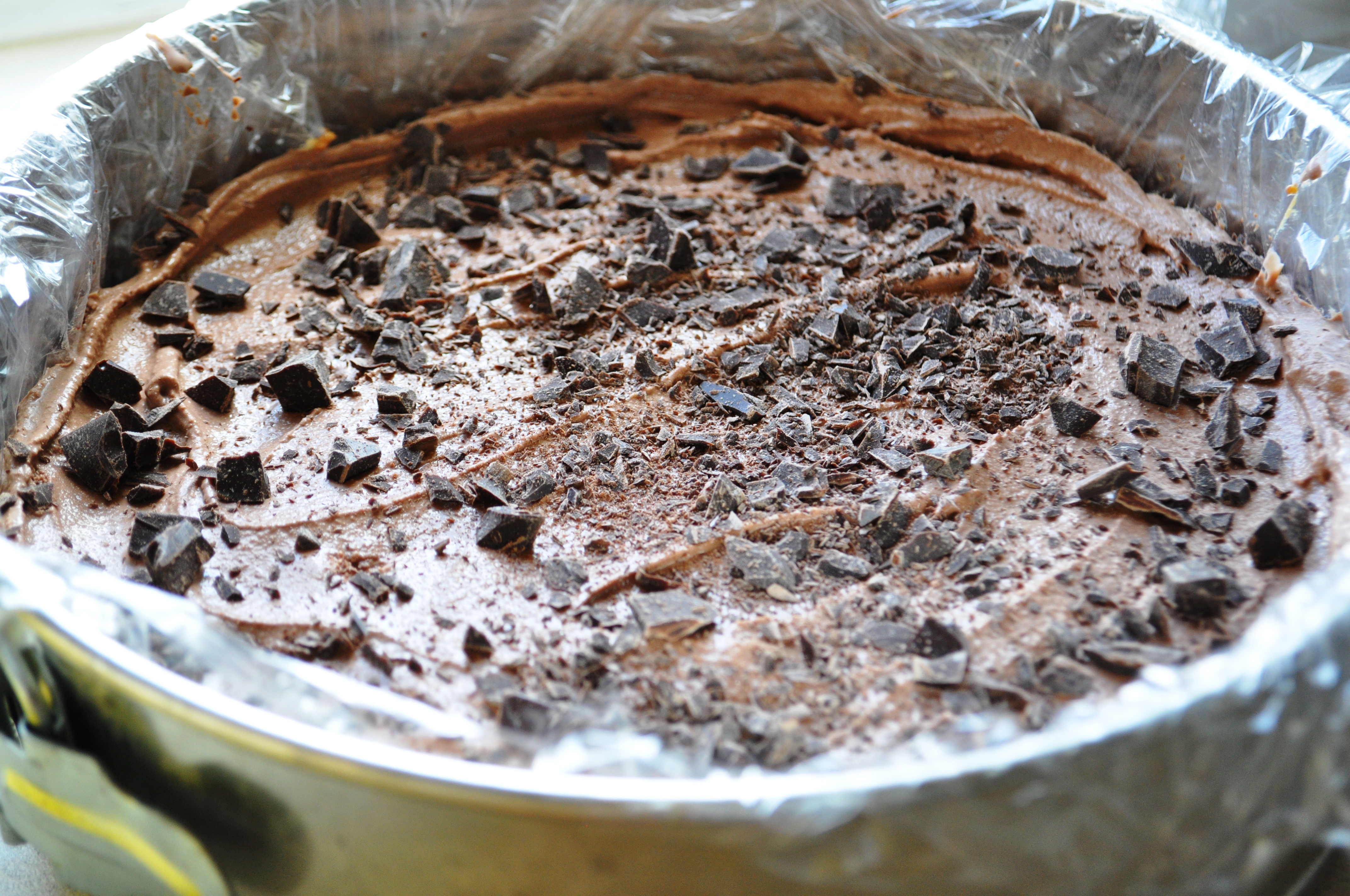 On this layer (the third layer) chop one ounce of chocolate and sprinkle over the top of the second pint of ice cream that you’ve spread over the frozen peanut butter. Cover with plastic and freeze for 45 minutes. Remove the last pint of ice cream and repeat the process.