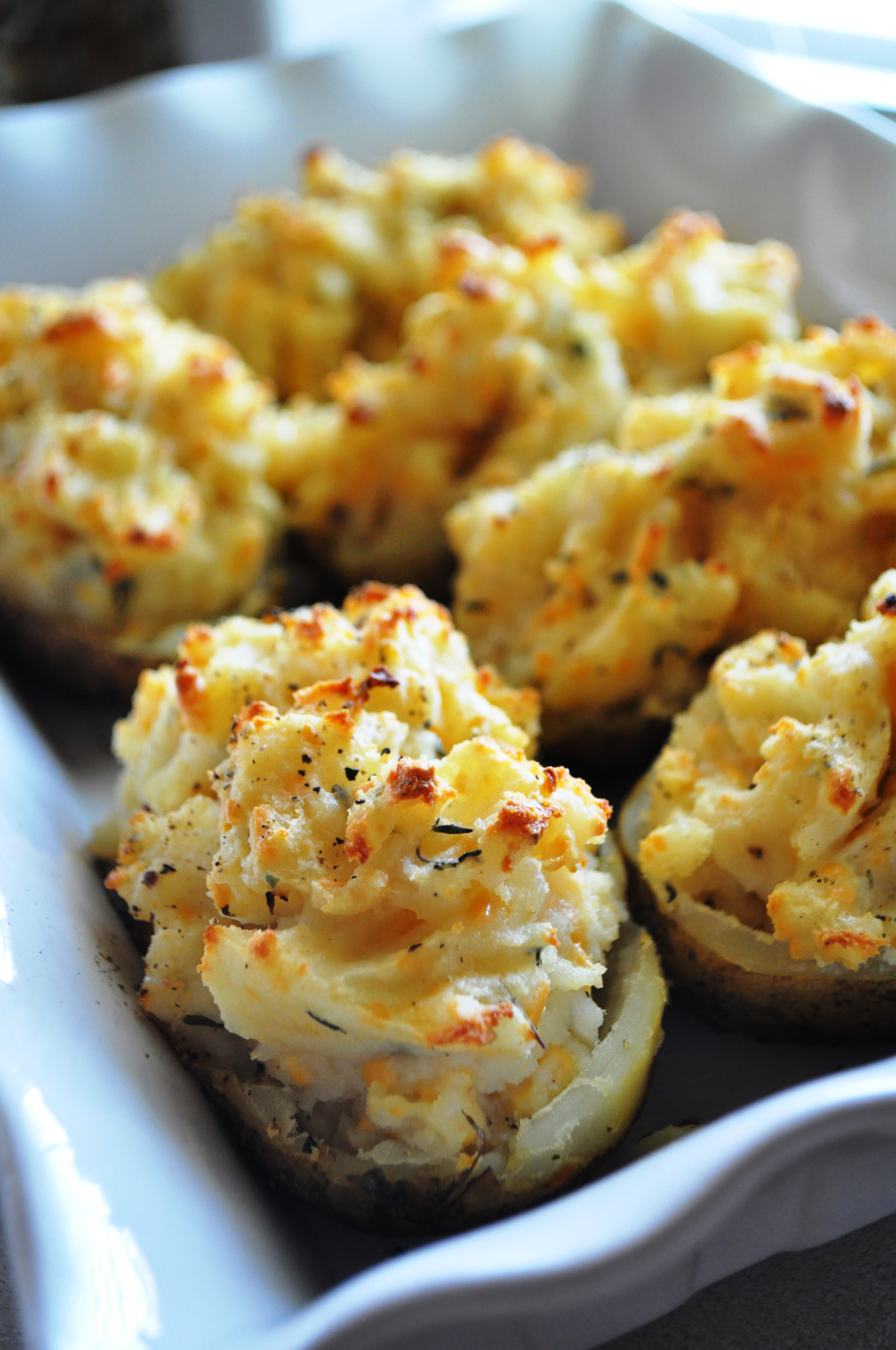 With a small spoon carefully spoon out the potato filling into a medium bowl. Leave enough potato in the skins so that the potato will stand on its own without collapsing in on itself. Place the skins in a baking dish.