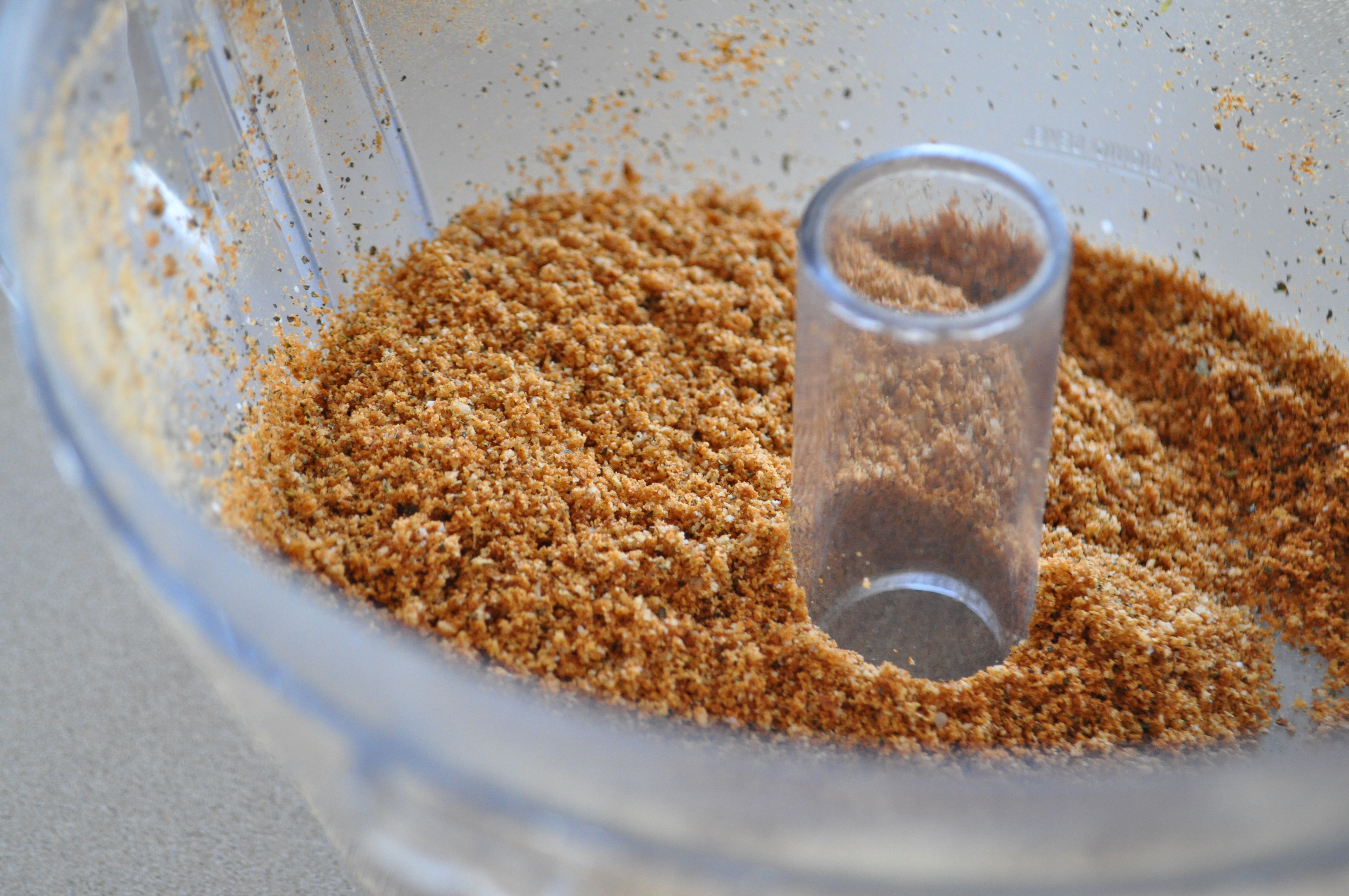 For bread crumbs I just add the toasted bread to a food processor. Add dried herbs, kosher salt, and  just a bit of olive oil. Pulse until it turns into crumbs and the herbs are incorporated. For this recipe I added basil, oregano, garlic powder, kosher salt, vegan parmesan, and added a drizzle of olive oil at the end so it would all come together a bit.