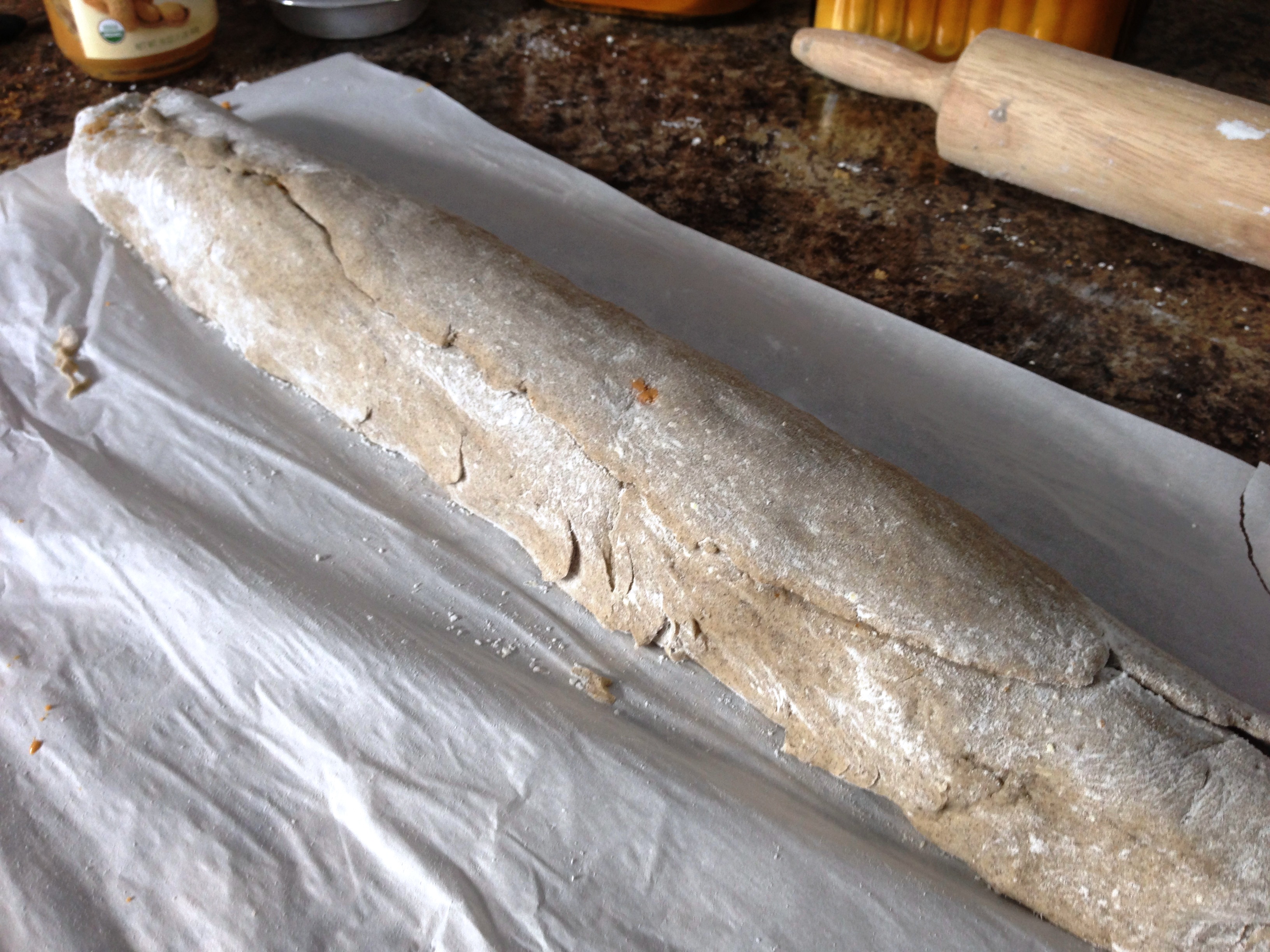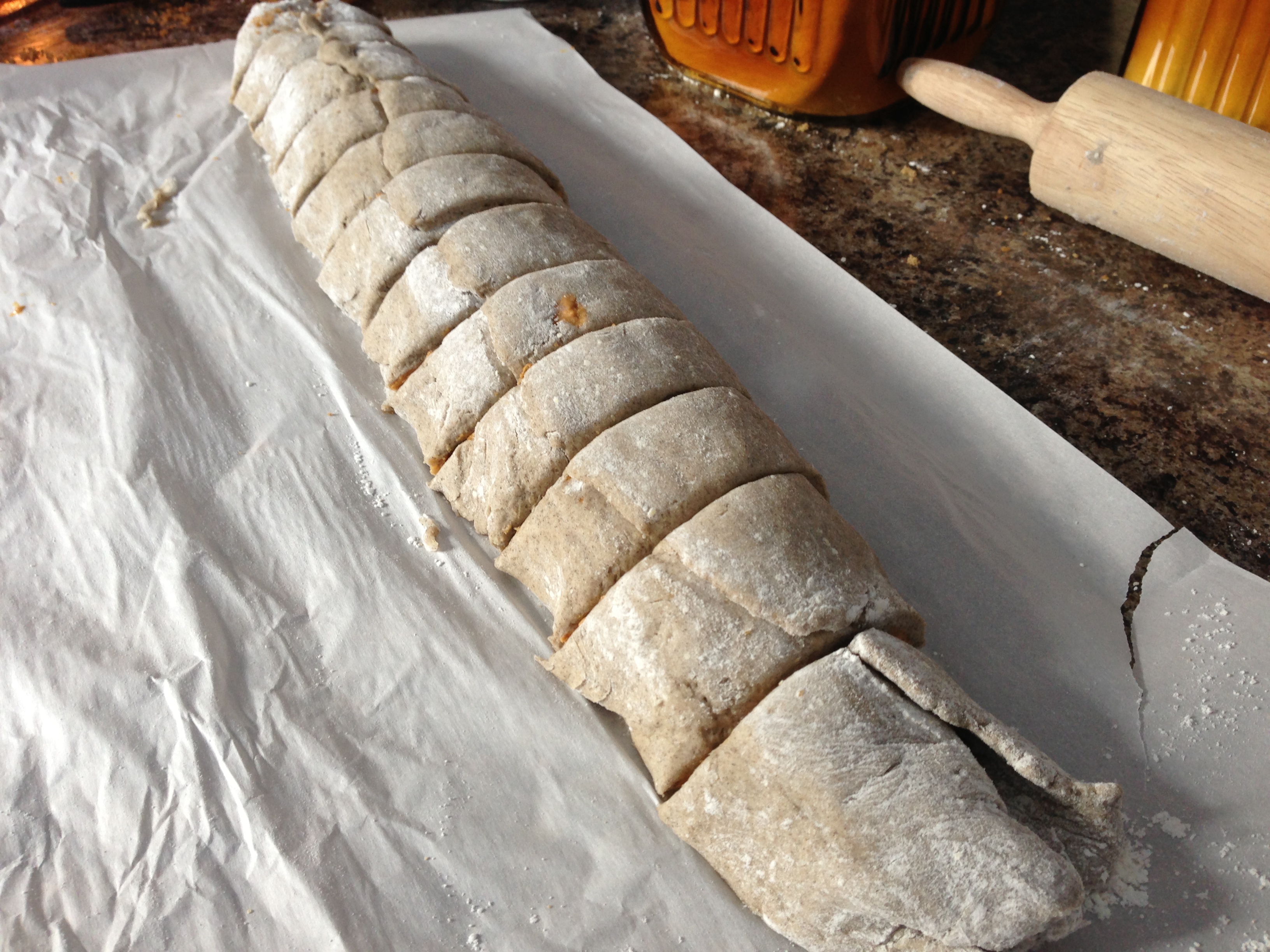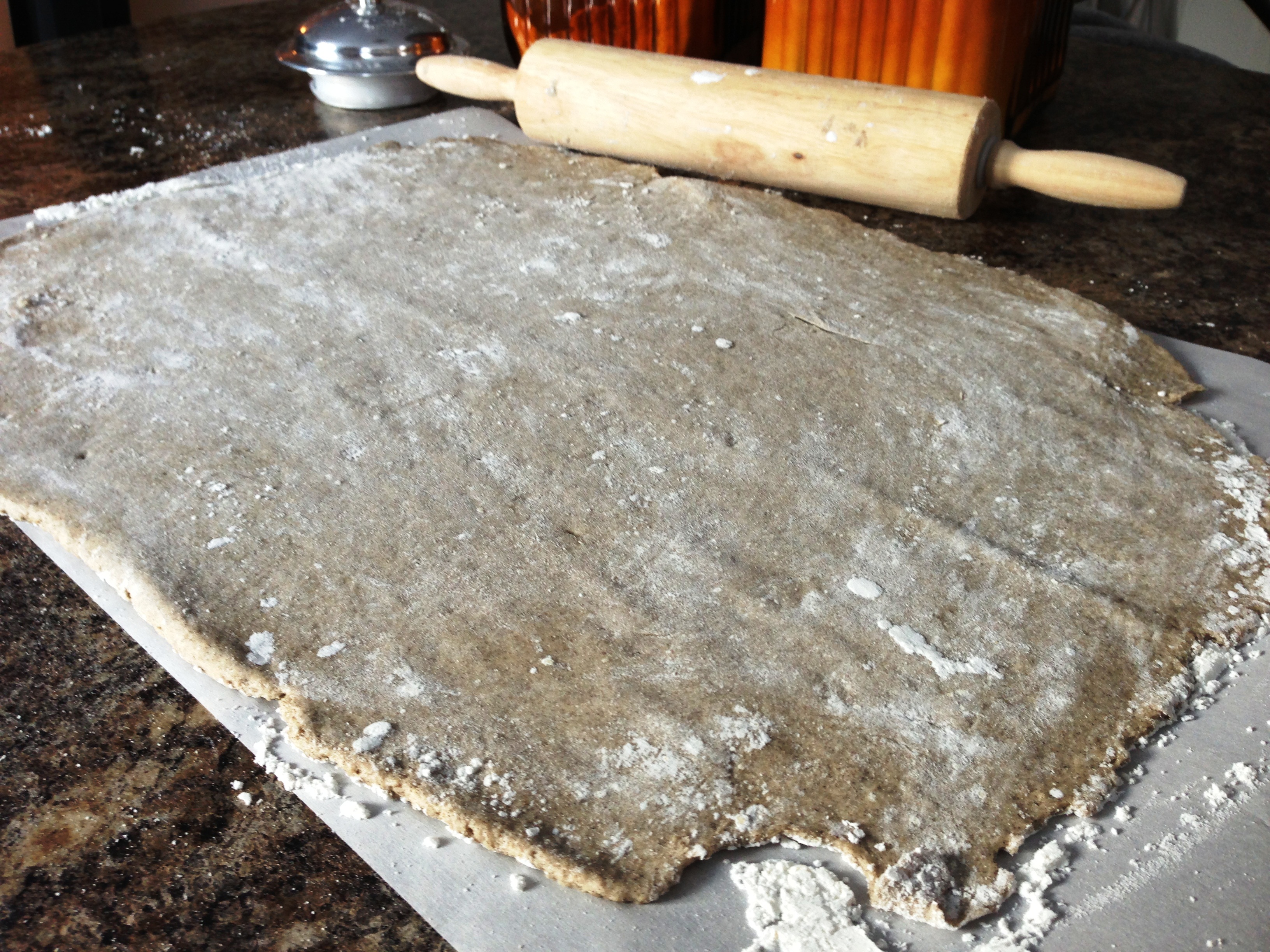 Flour parchment paper and place dough on parchment. Sprinkle with flour. Pat out dough and roll out with a floured rolling pin to about a 1/4 inch thickness.