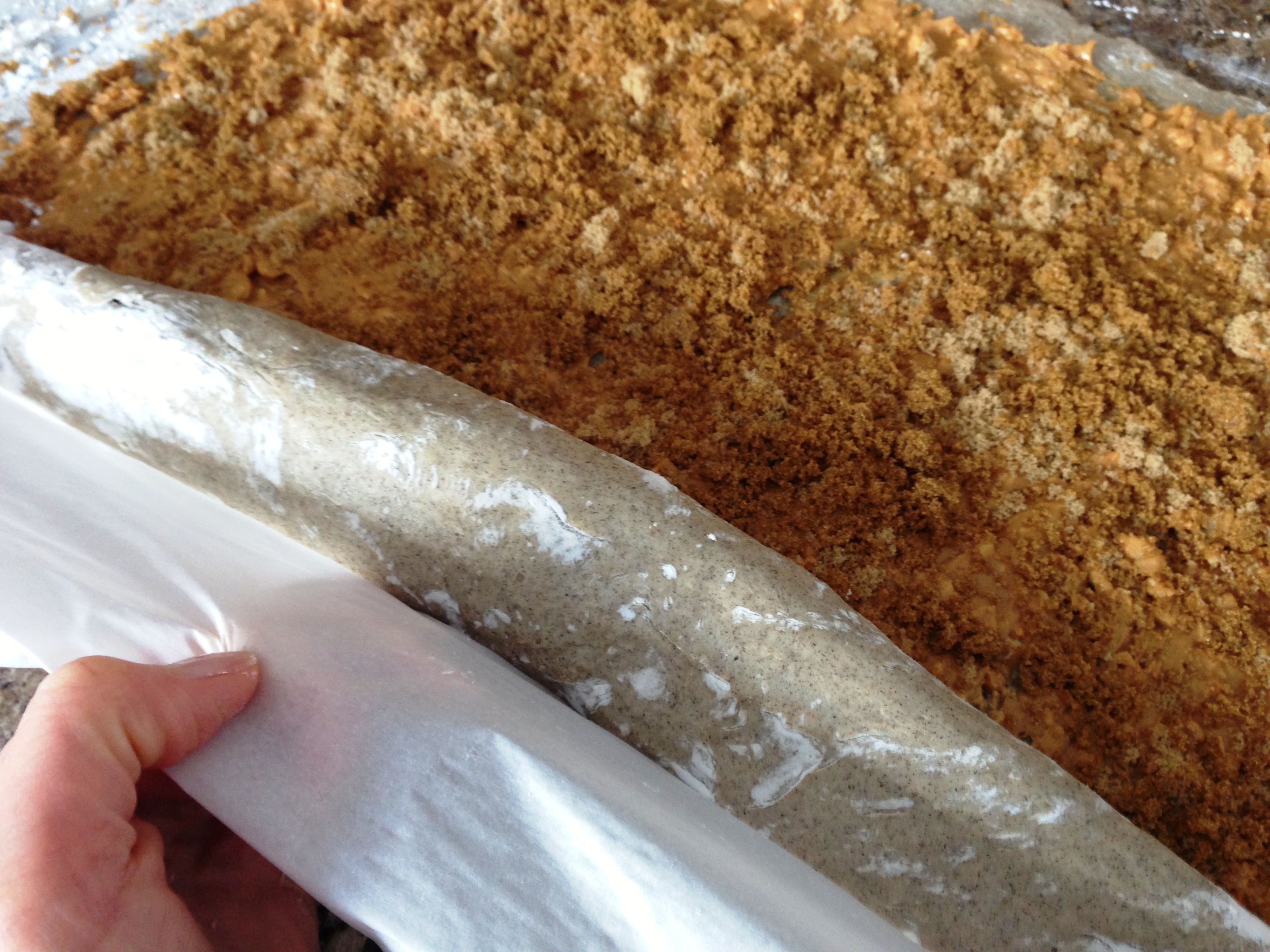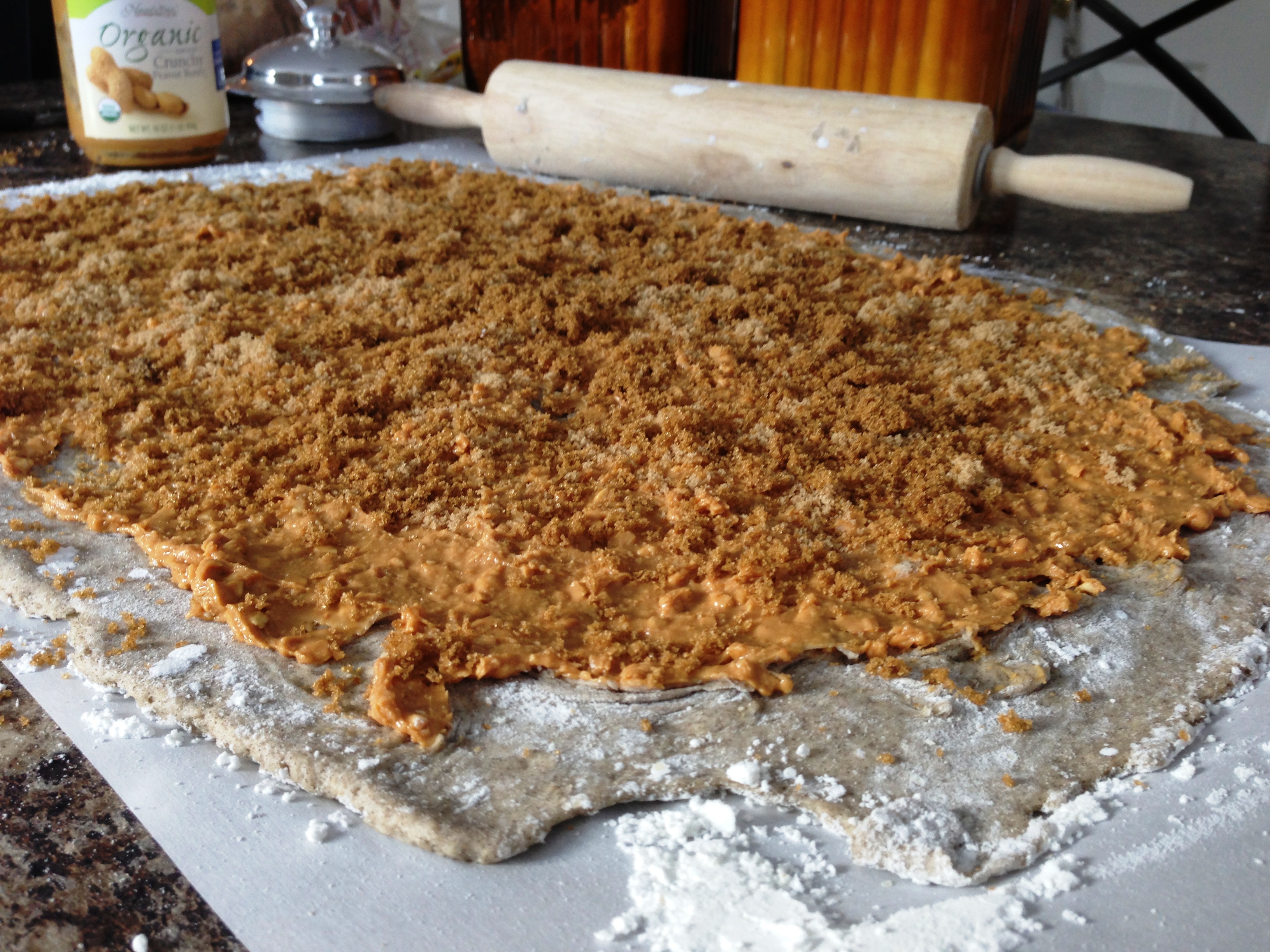 Spoon half of the peanut butter onto the dough. Carefully spread the peanut butter with the back of a spoon. Add the remaining peanut butter and connect “the dots” with the back of the spoon. Once the majority of the dough is covered, it will be easier to smooth. Sprinkle the peanut butter with the dark brown sugar. Carefully roll the dough.