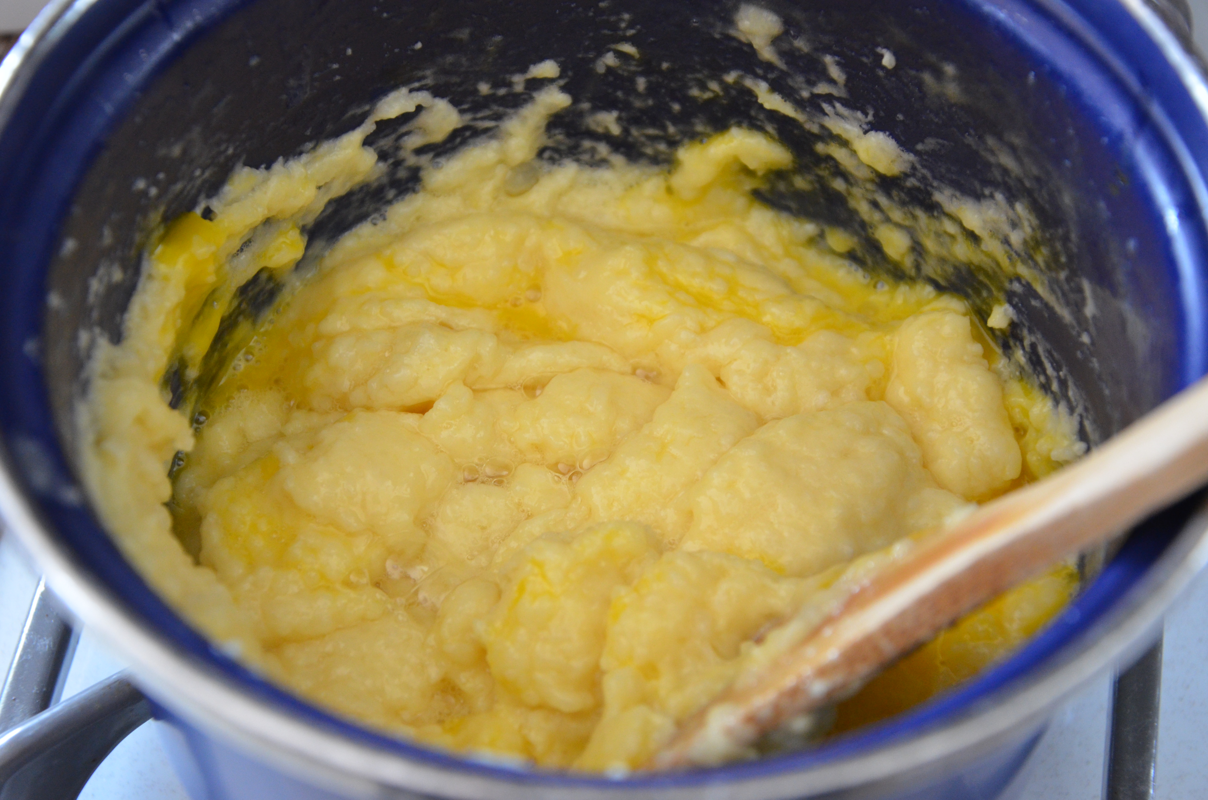 Add the eggs one  at a time and stir vigorously with a wooden spoon.