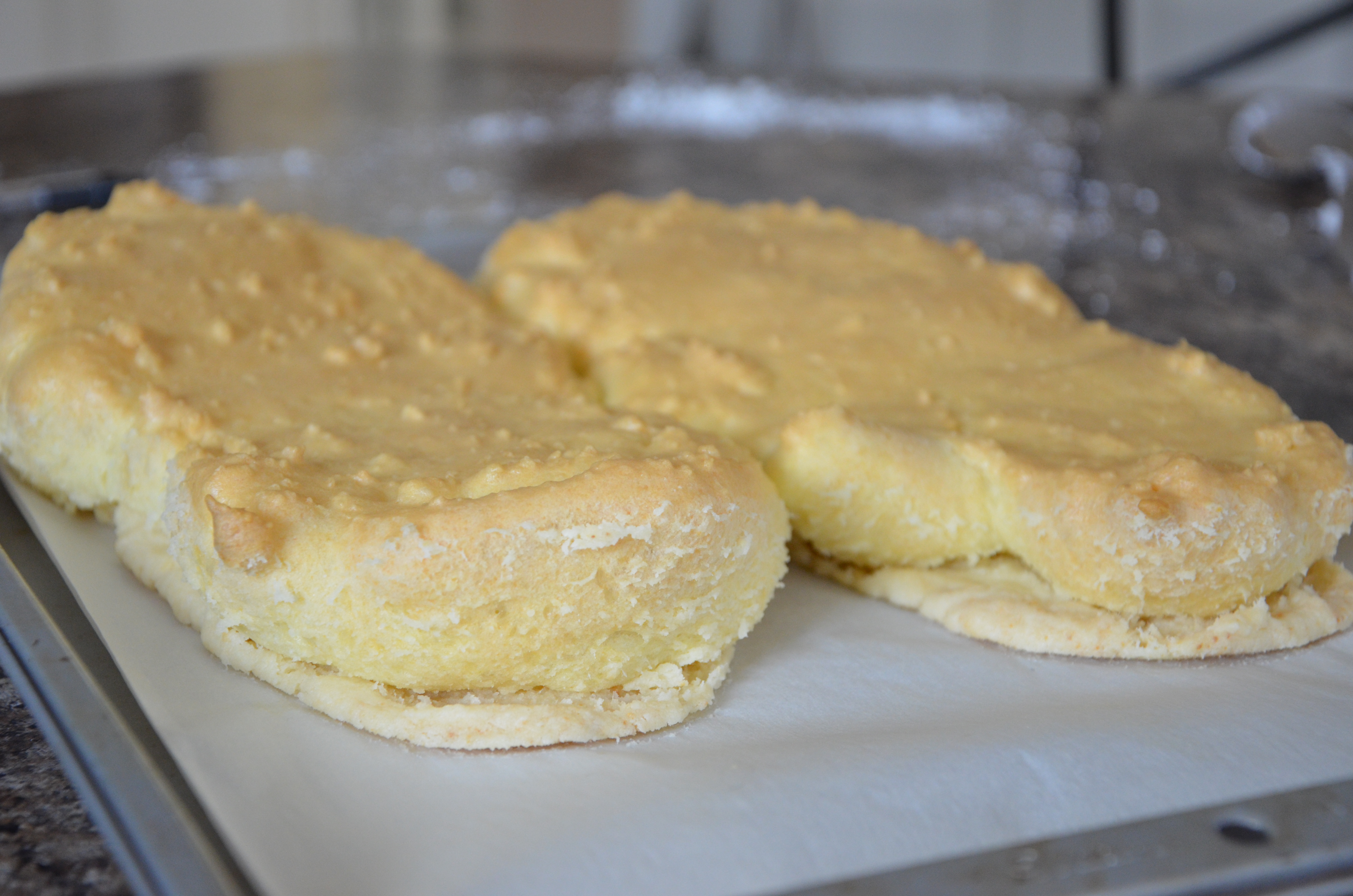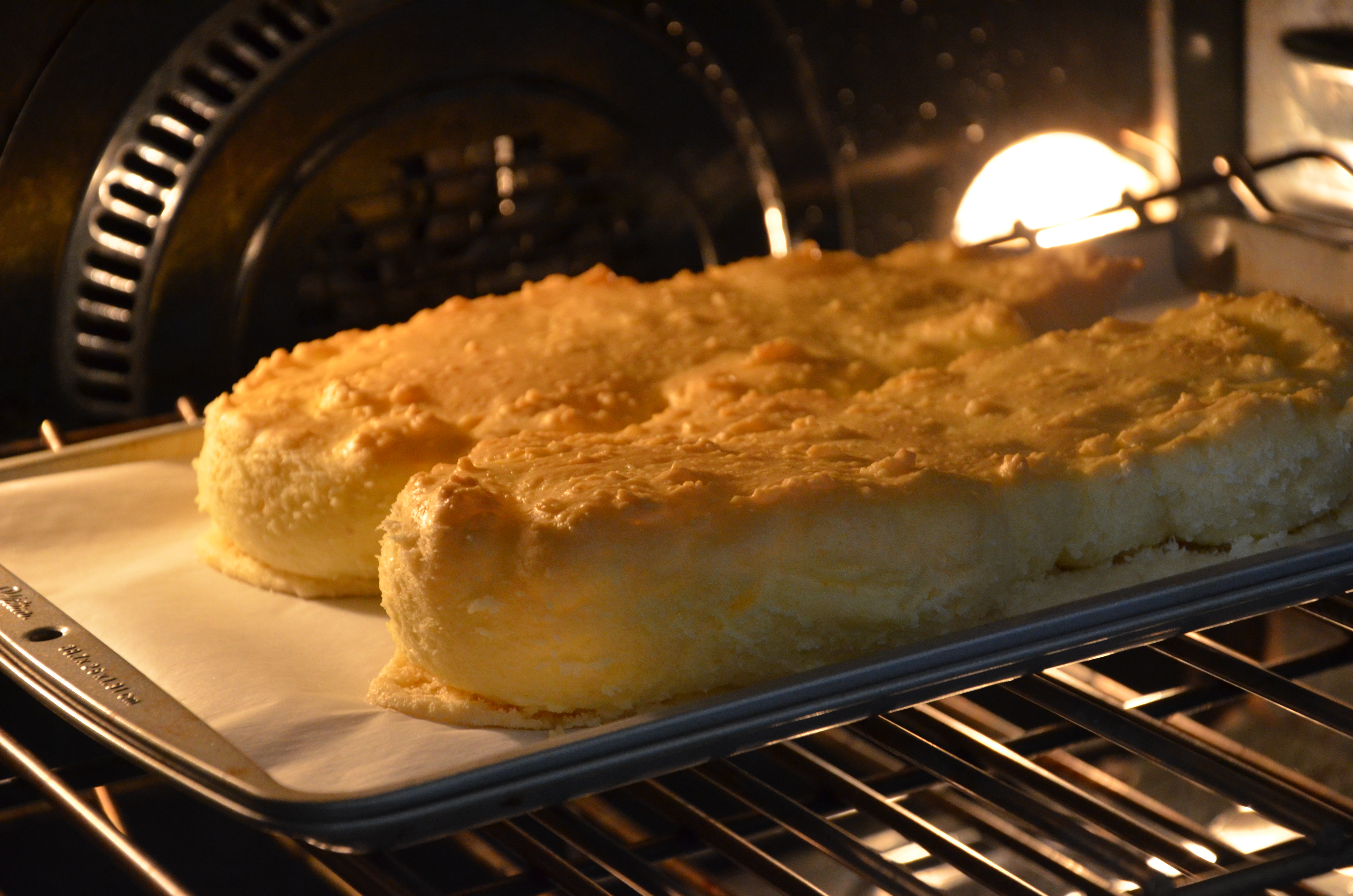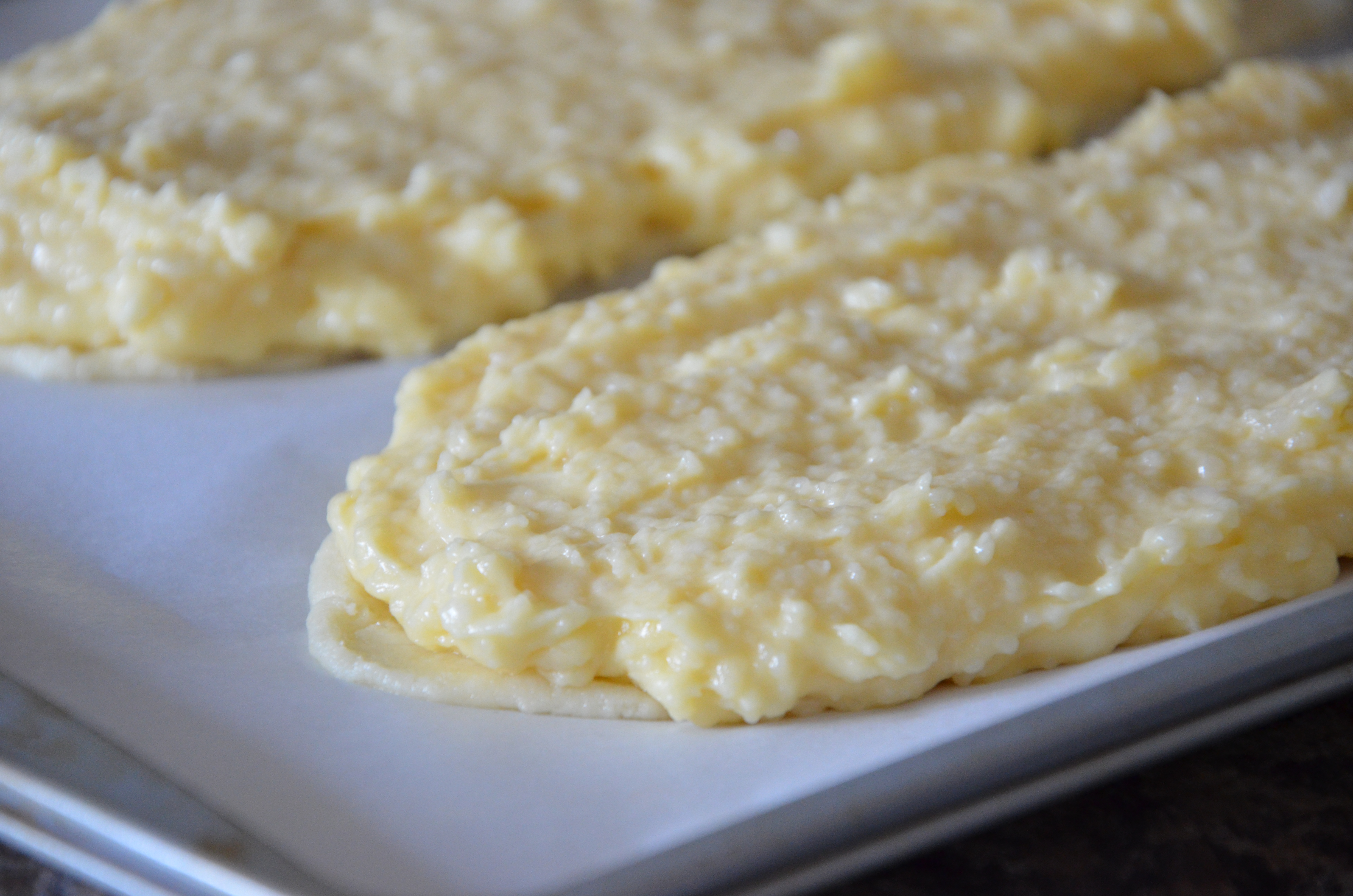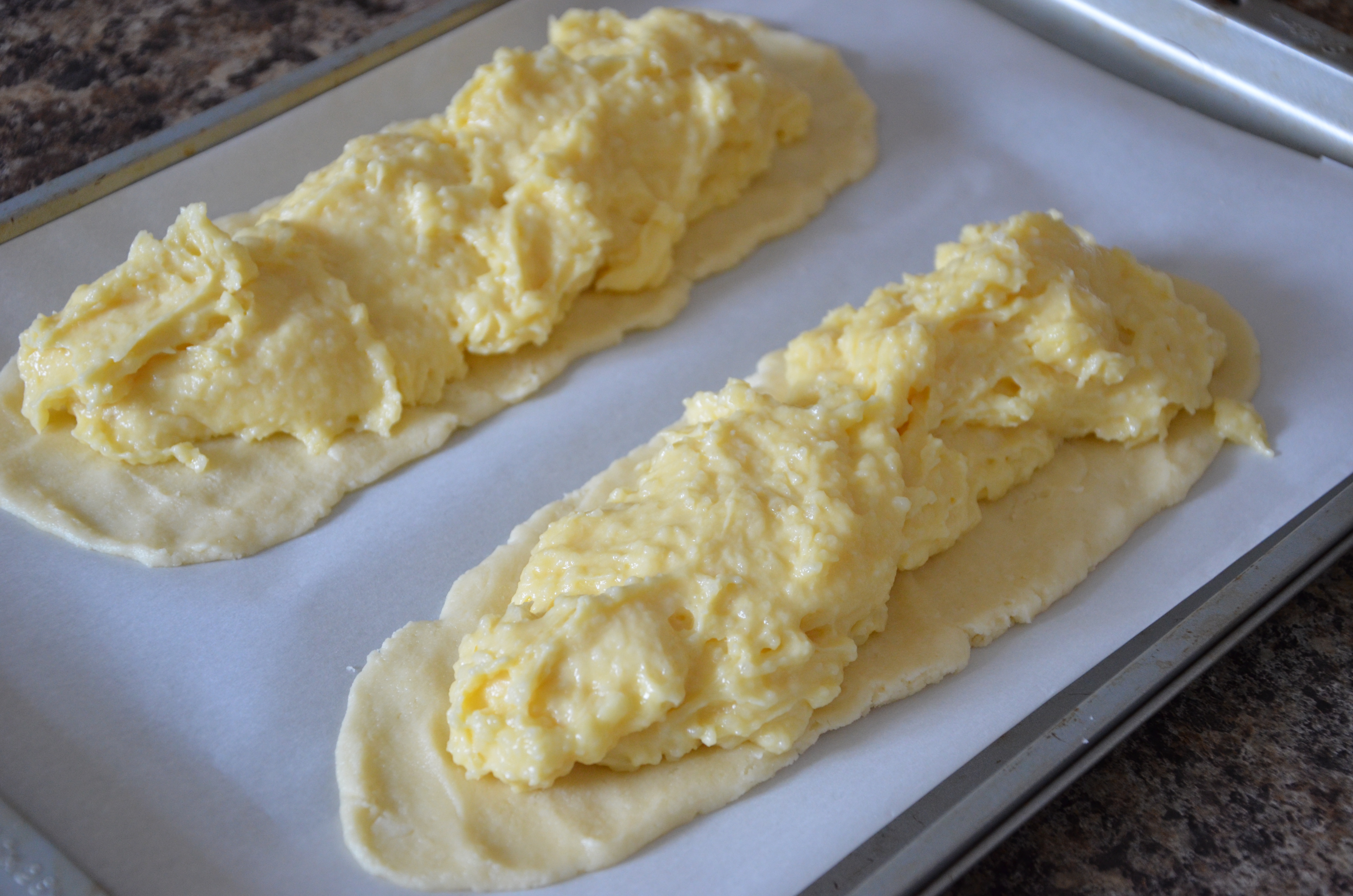 Divide the dough in half and pat out into 2 –  3×10 inch strips on a parchment covered baking sheet and set aside.