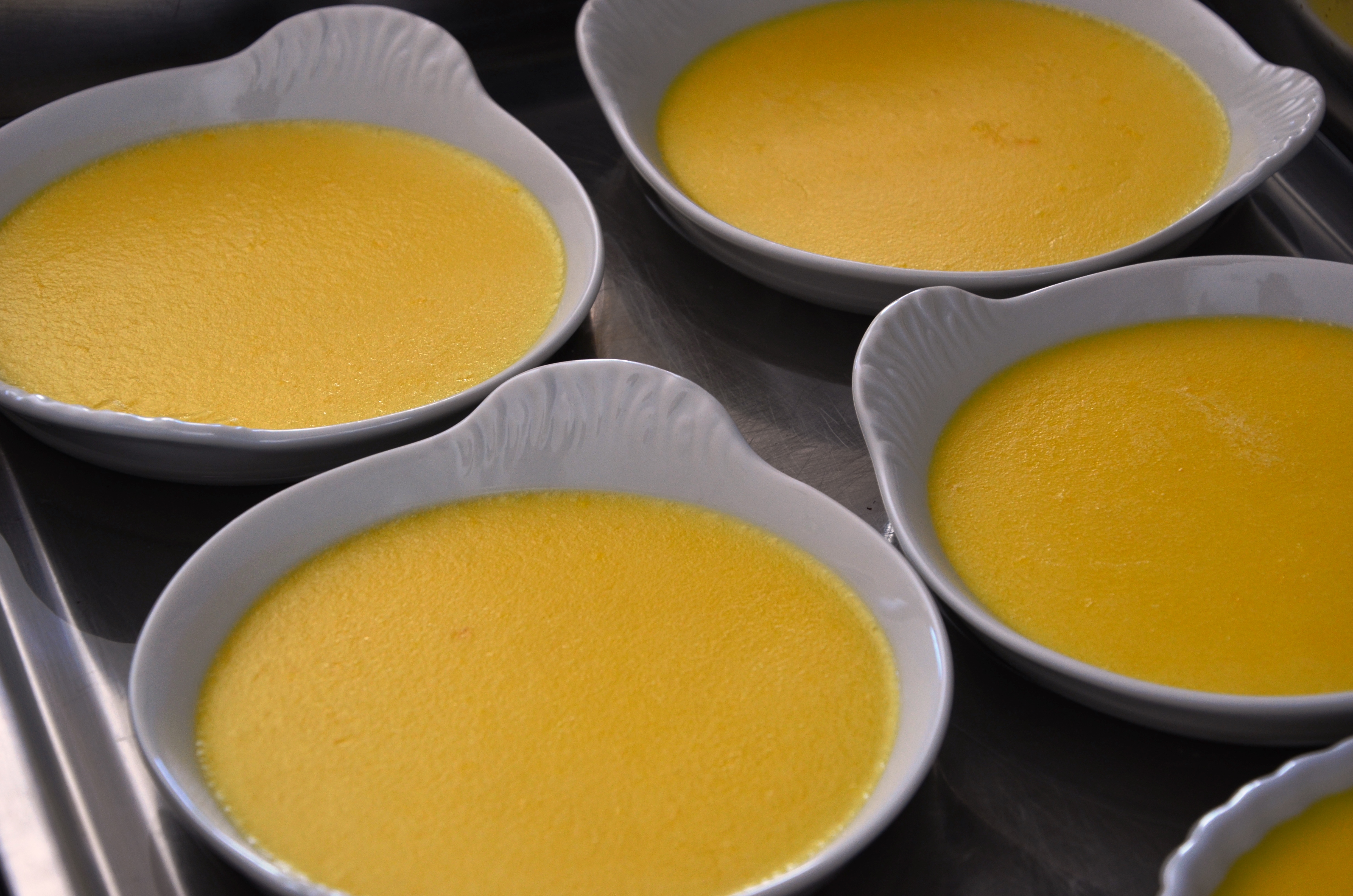 Preheat oven to 325 degrees, place 6 ramekins in a large roasting pan and set aside, and start a tea kettle of water to boil.