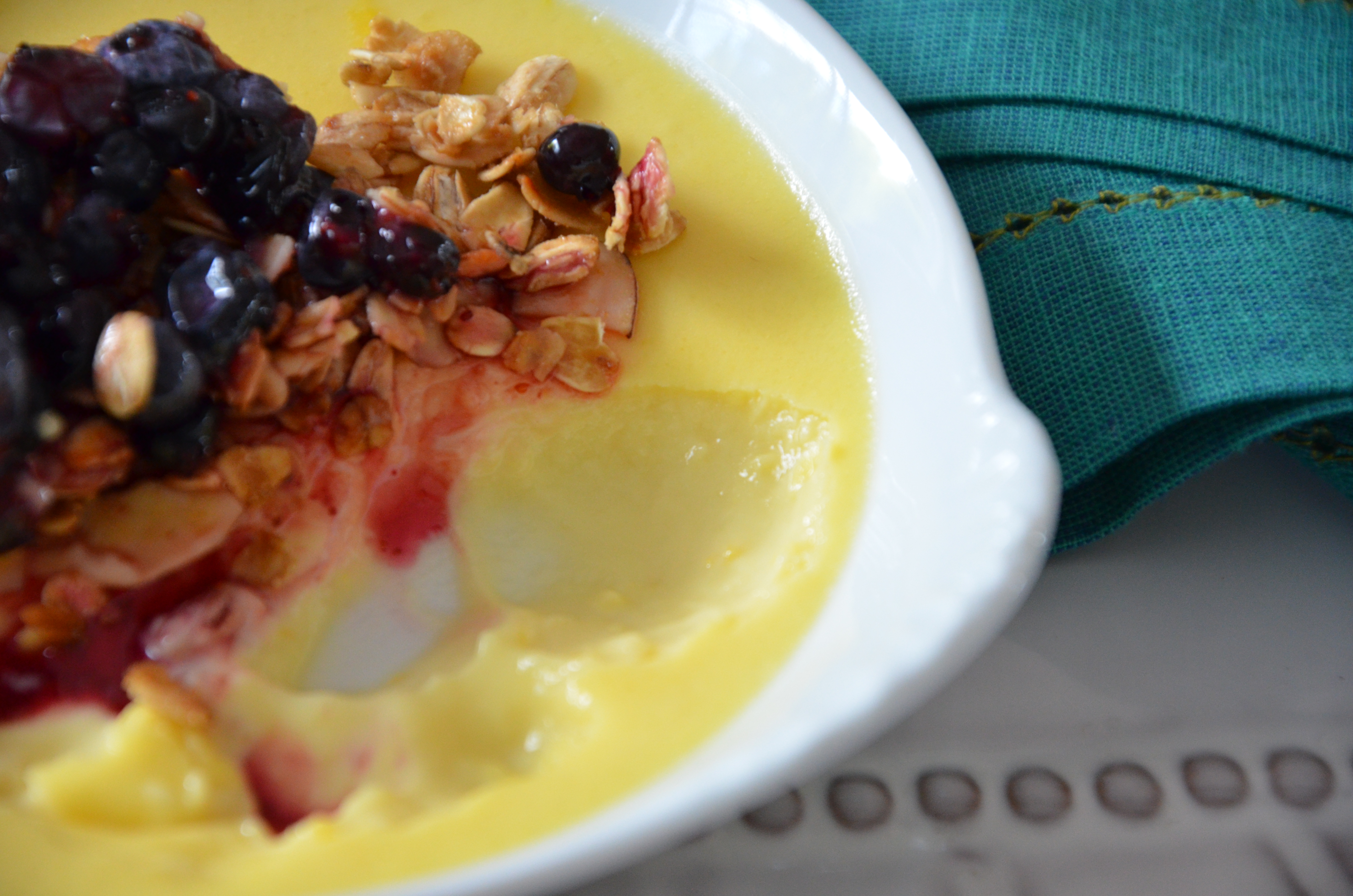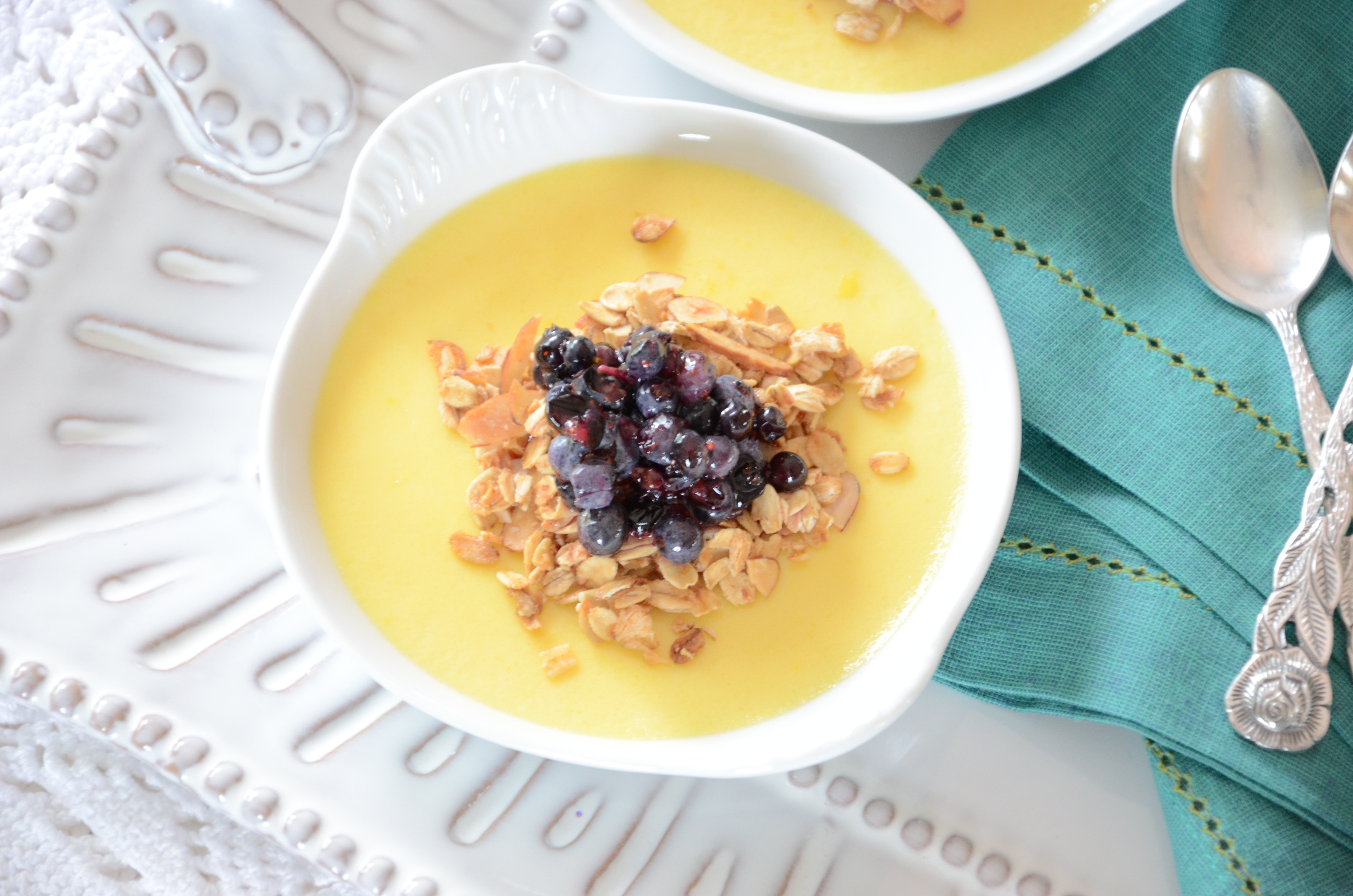 Top the chilled pots de creme with a bit of granola, and a bit of the wild Maine blueberries.