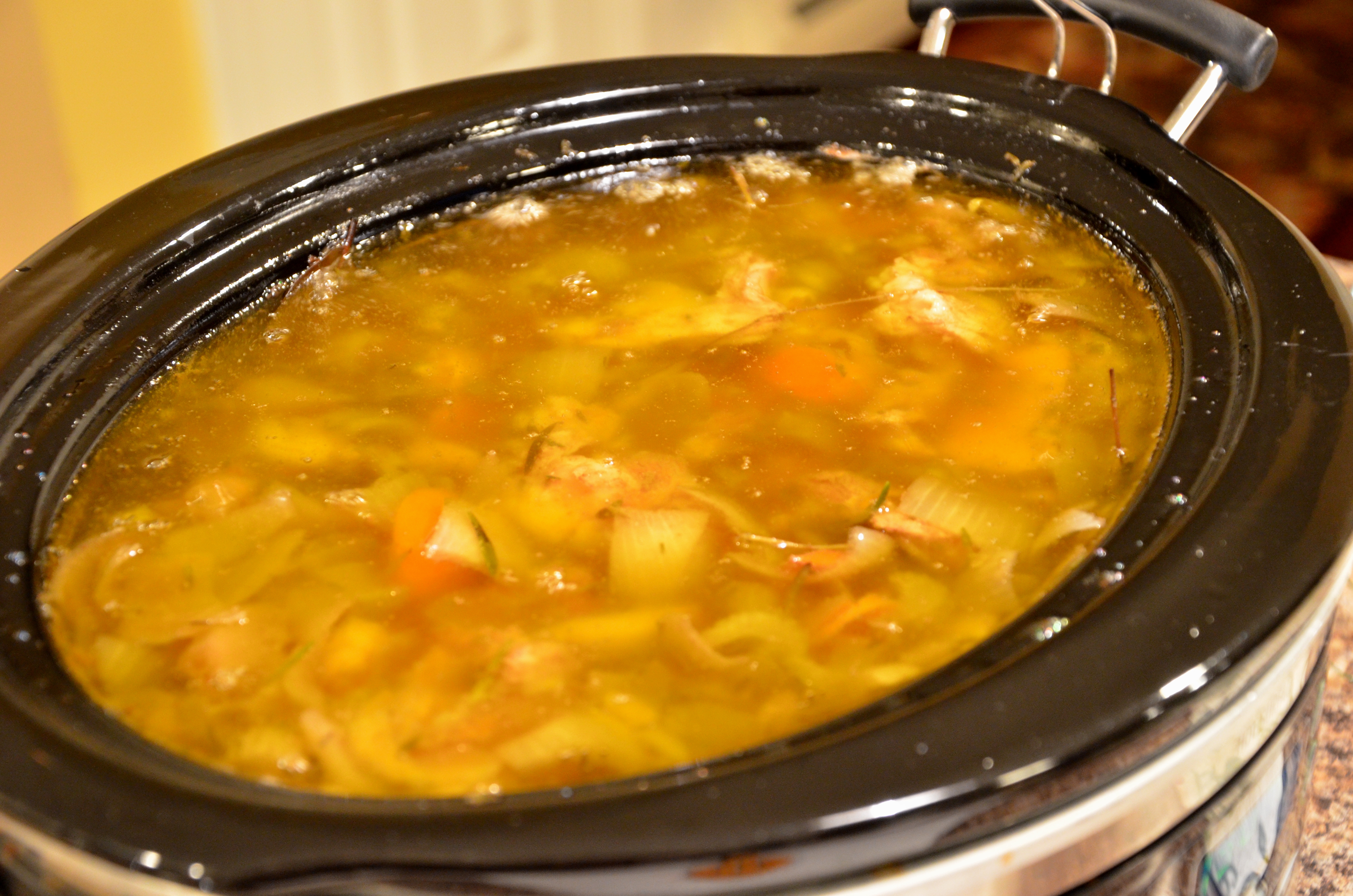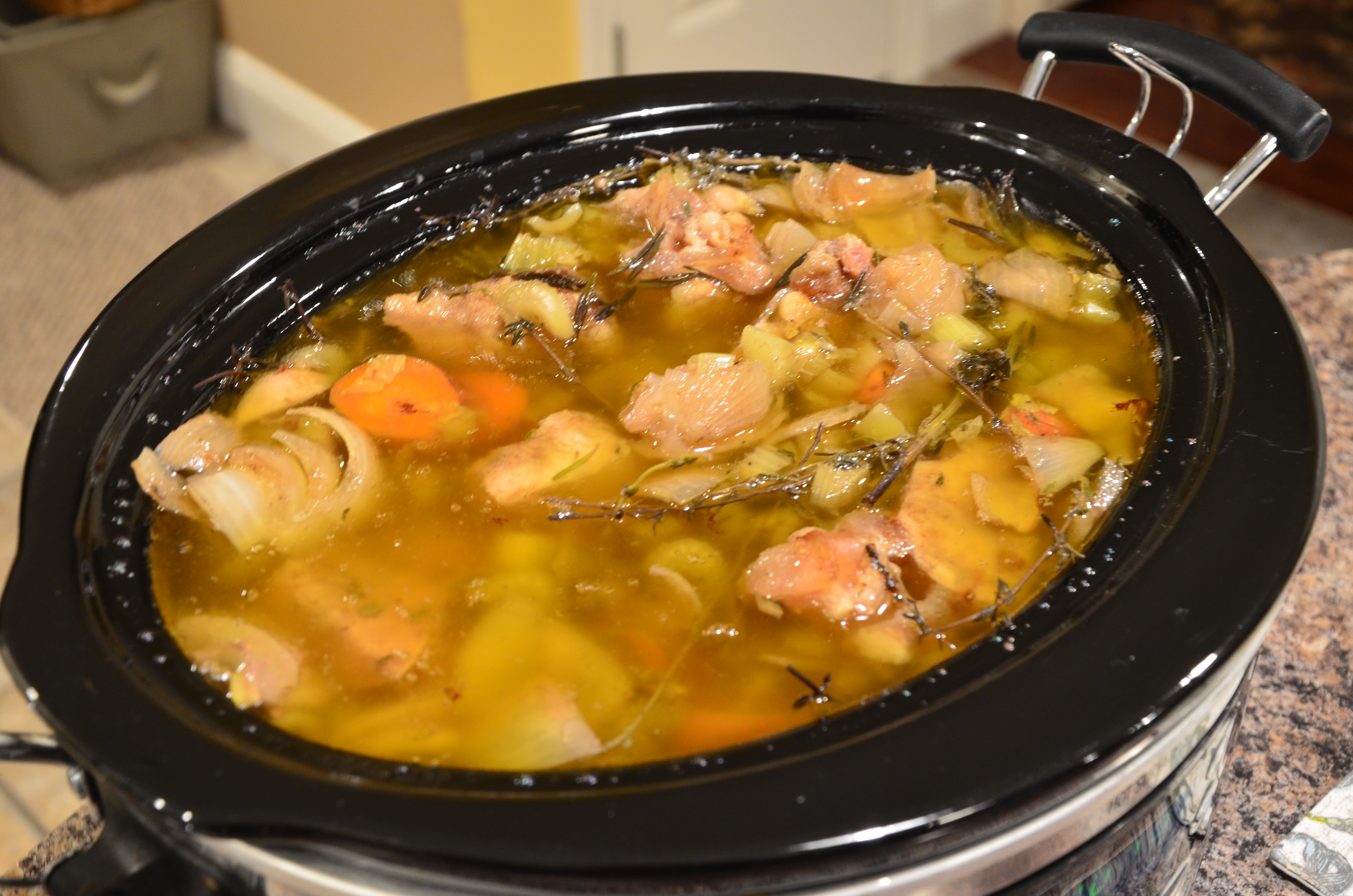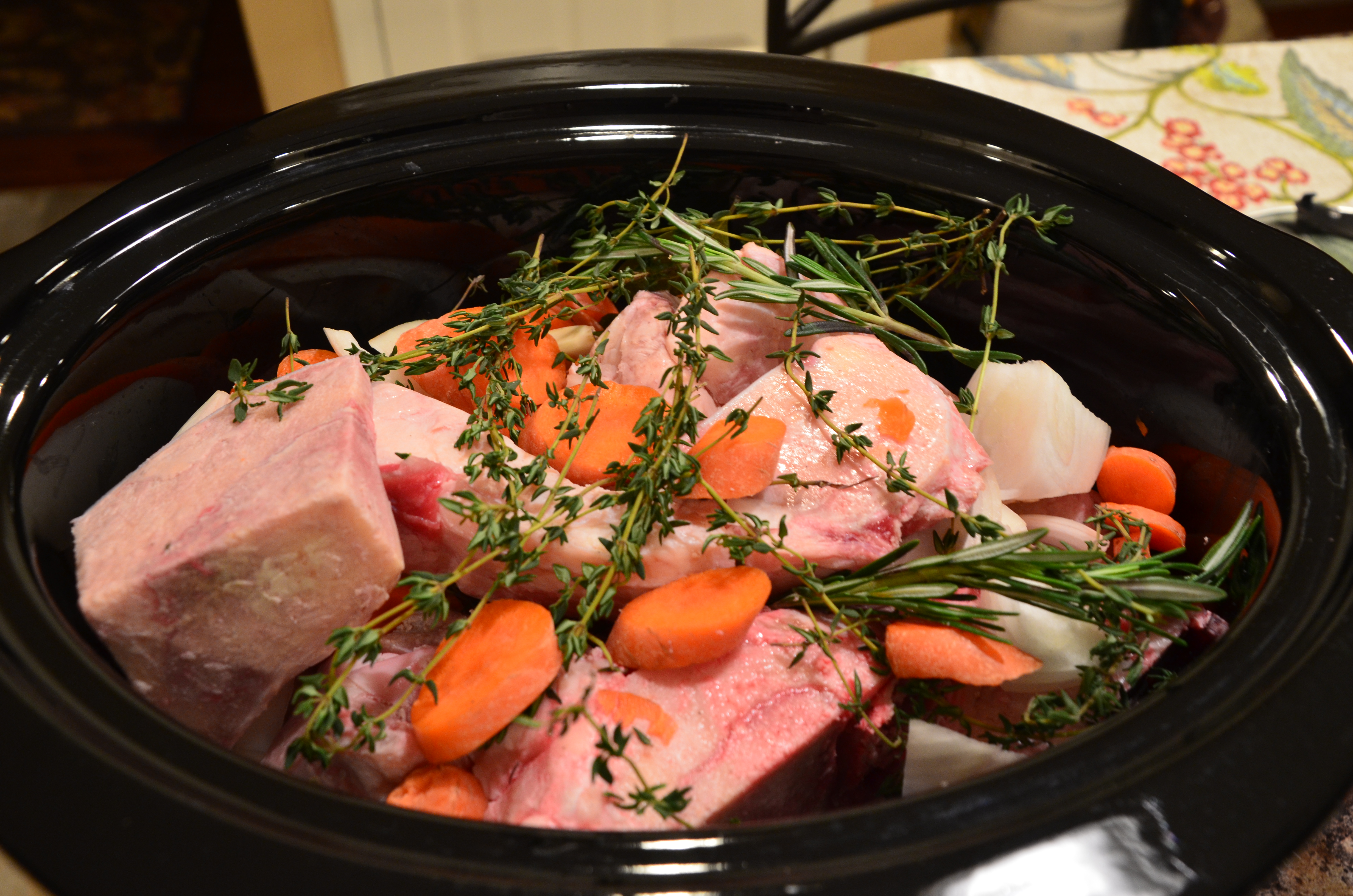 Cover the vegetables and bones with filtered or spring water. Cover and cook on low for  at least 24 hours. My crockpot only cooks for 12 hours so I had to reset it for another 12.