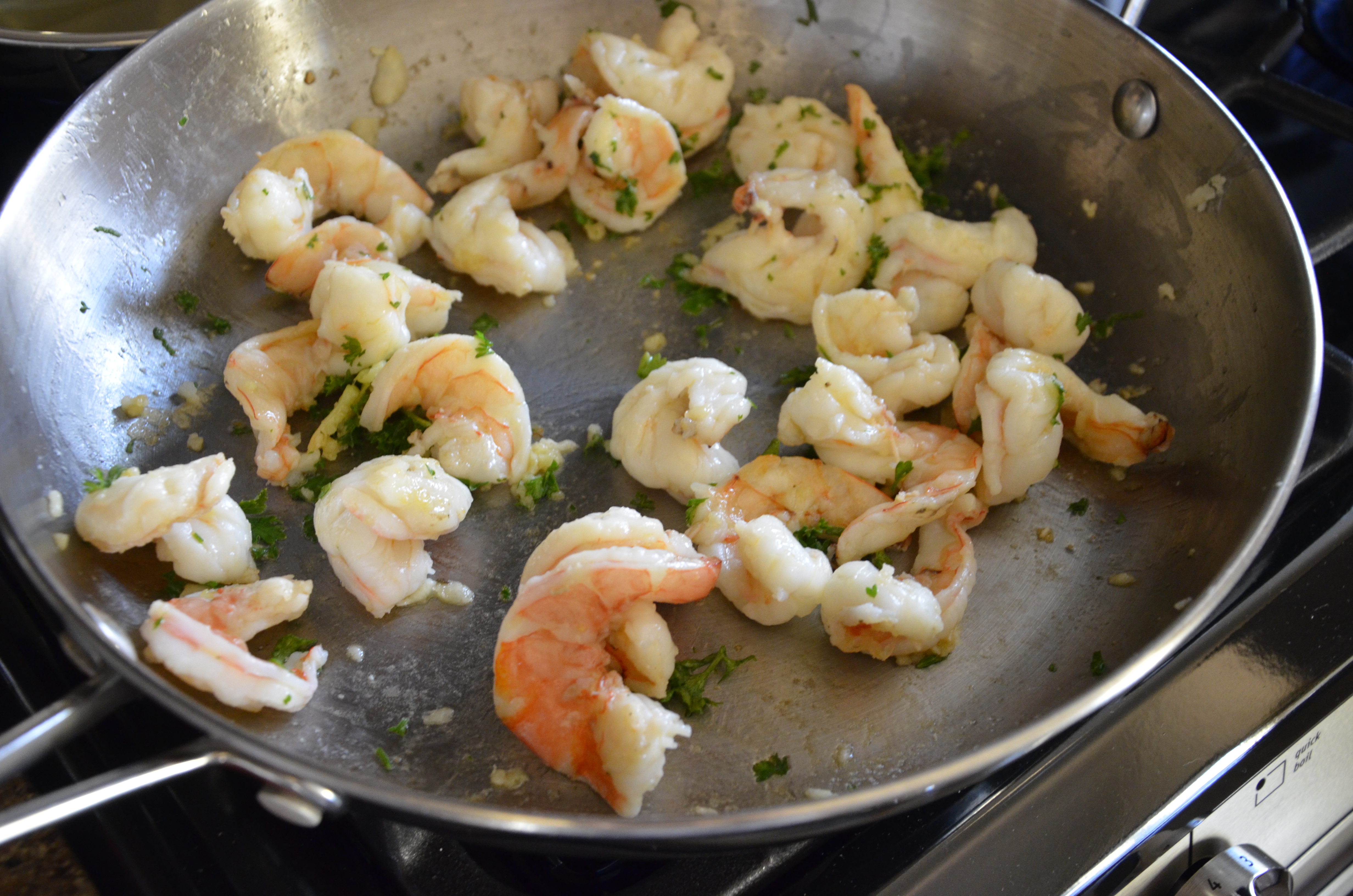 Oil two medium-large skillets with olive oil and heat to medium. Add the shrimp to one and the halibut to the other. Add the pressed garlic to the shrimp and a pinch or two of sea salt. Saute for just a few minutes until the shrimp curls and is pink. While the shrimp is sauteing, sprinkle garlic powder across the top of the halibut and add a pinch or two of sea salt. Add about 1/8 cup of water and cover, steaming for 10 minutes. If you’re using very large shrimp, slice them down the middle as if you were butterflying them but all the way through. After sauteing, cut them again, but in half.
