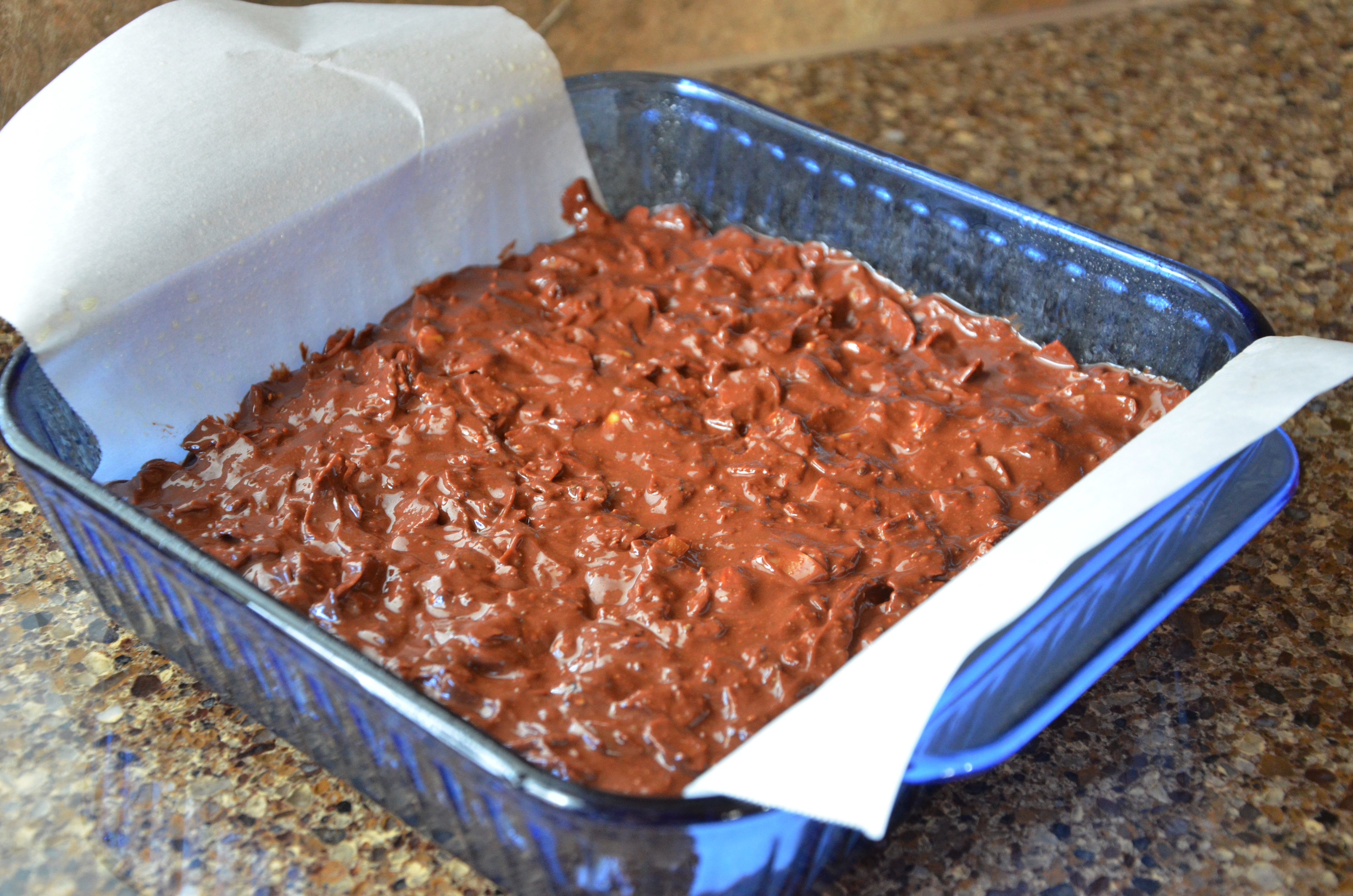 In a medium saucepan melt the cashew butter, raw honey, and coconut oil. Do not boil. Turn off the heat and add the chopped chocolate. Stir until completely melted. Add the remaining ingredients and stir until fully incorporated. Spoon into the prepared dish, smooth, and refrigerate until partially set, 1-2 hours. Remove from fridge and score into about 1 1/2 to 2 inch squares. Return to the fridge to set completely (4 hours or overnight). Run knife along sides of pan and lift chocolate bars out of pan with parchment paper. Using a sharp butcher knife or large knife, cut into bars. Store in the fridge in an airtight container.