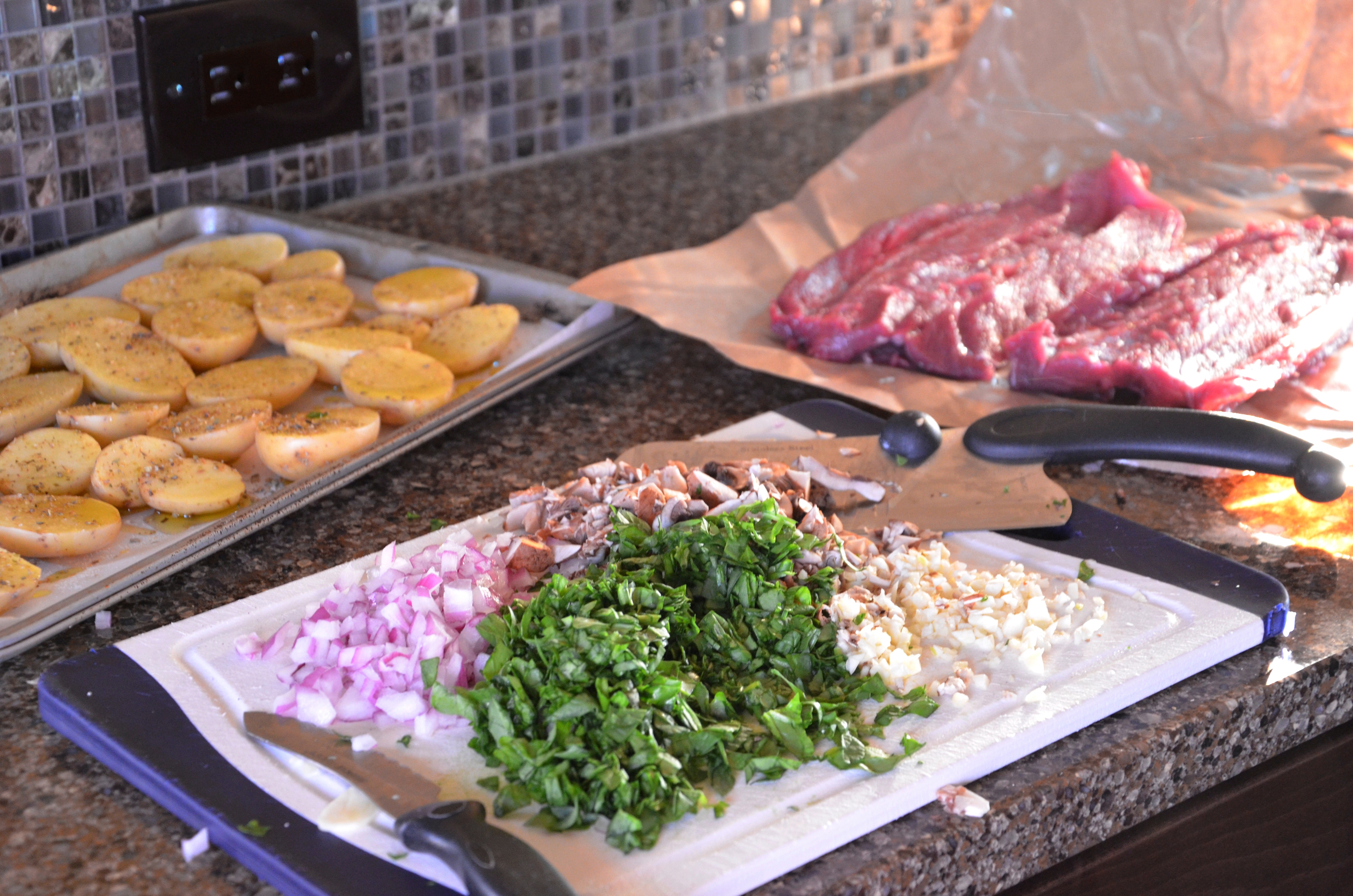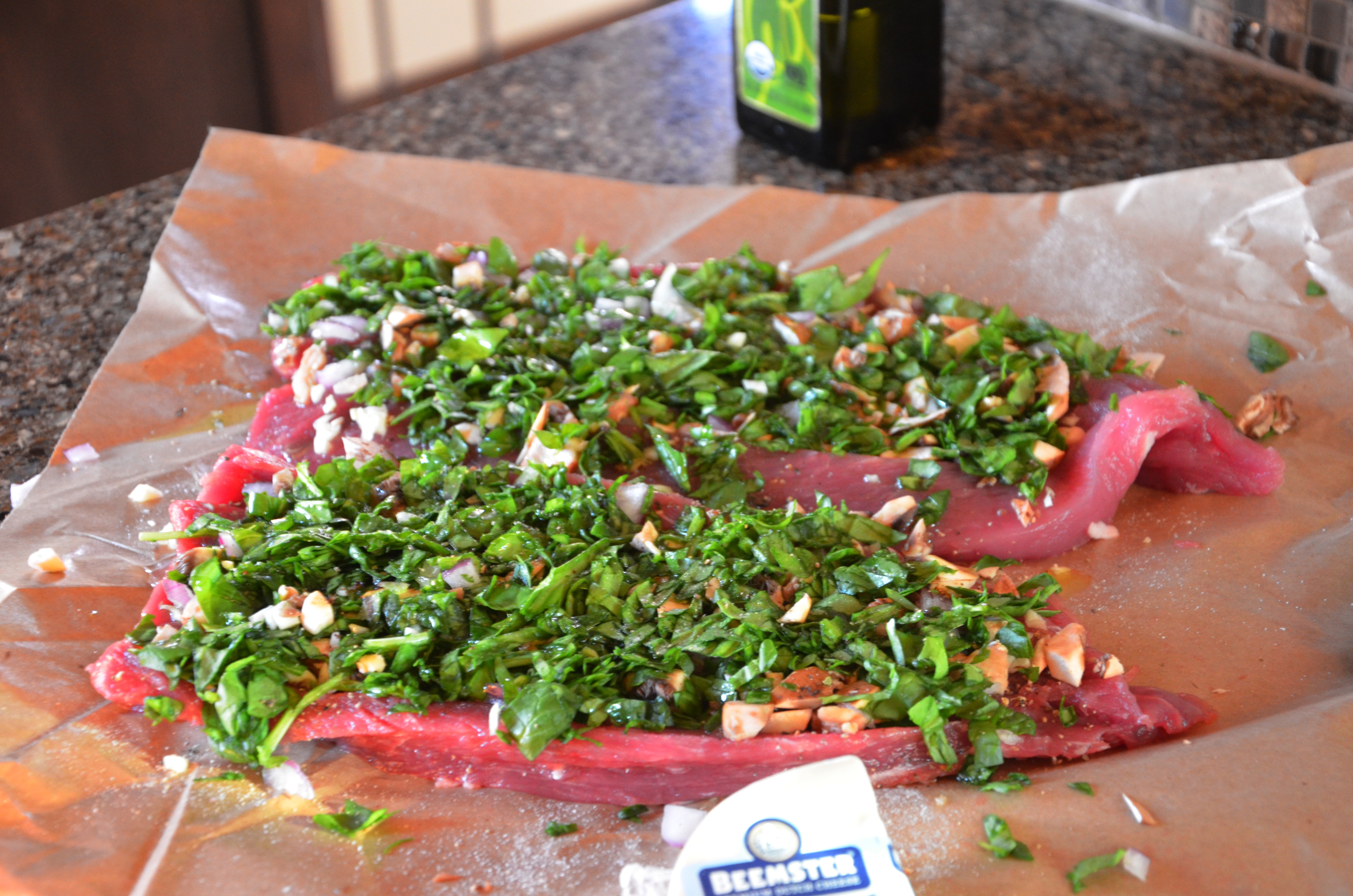 Butterfly the tenderloin pieces. Mine ended up being kind of a disaster, they were not cooperative. Chop and dice the vegetables and garlic. Layer on top of the tenderloin. Drizzle with olive oil. Salt and pepper generously. Sprinkle grated cheese on top. If you’re able to roll your tenderloin, roll it closed and secure with the skewers. I wasn’t able to so I just closed mine up like a taco, worked fine. Drizzle with more olive oil, season again generously with salt and pepper and the Bragg seasoning.
