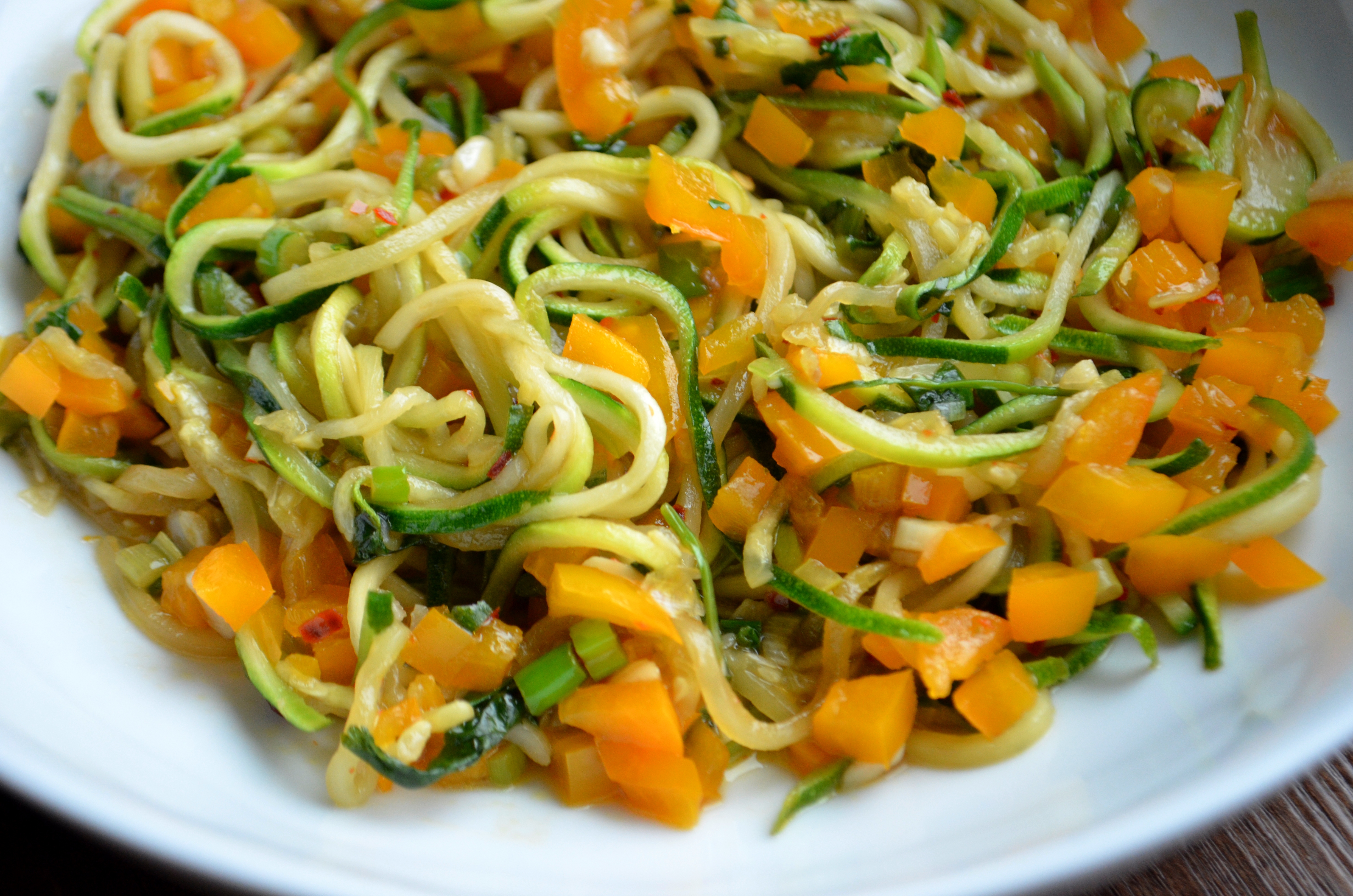 Saute the bell pepper with the olive oil, sesame oil, garlic, and crushed red pepper just until the bell pepper is aldente. Add the zucchini “noodles”, coconut aminos, and sweet chili sauce and toss until zucchini has softened. Not too soft! Add the green onion and cilantro, a pinch of sea salt, and toss to combine.