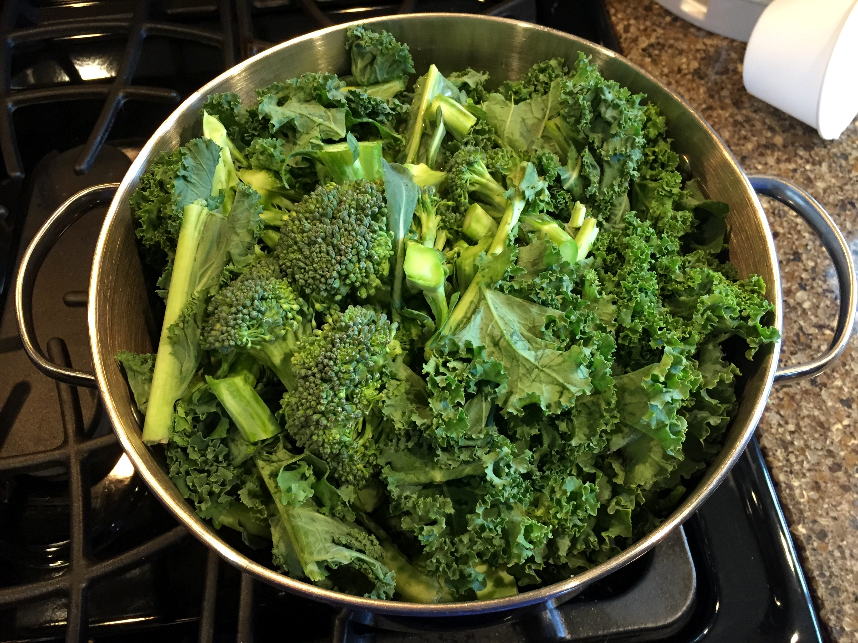 Put the broccoli and kale in a steamer on the stove. I fill my pot right up to the edge of the steamer. You don’t want too much water, as you will use this in your soup after the steaming is completed. Steam the vegetables until they are fork tender, but not mushy. I choose to steam them rather than boil them in the broth because steaming allows them to keep a strong, green color.