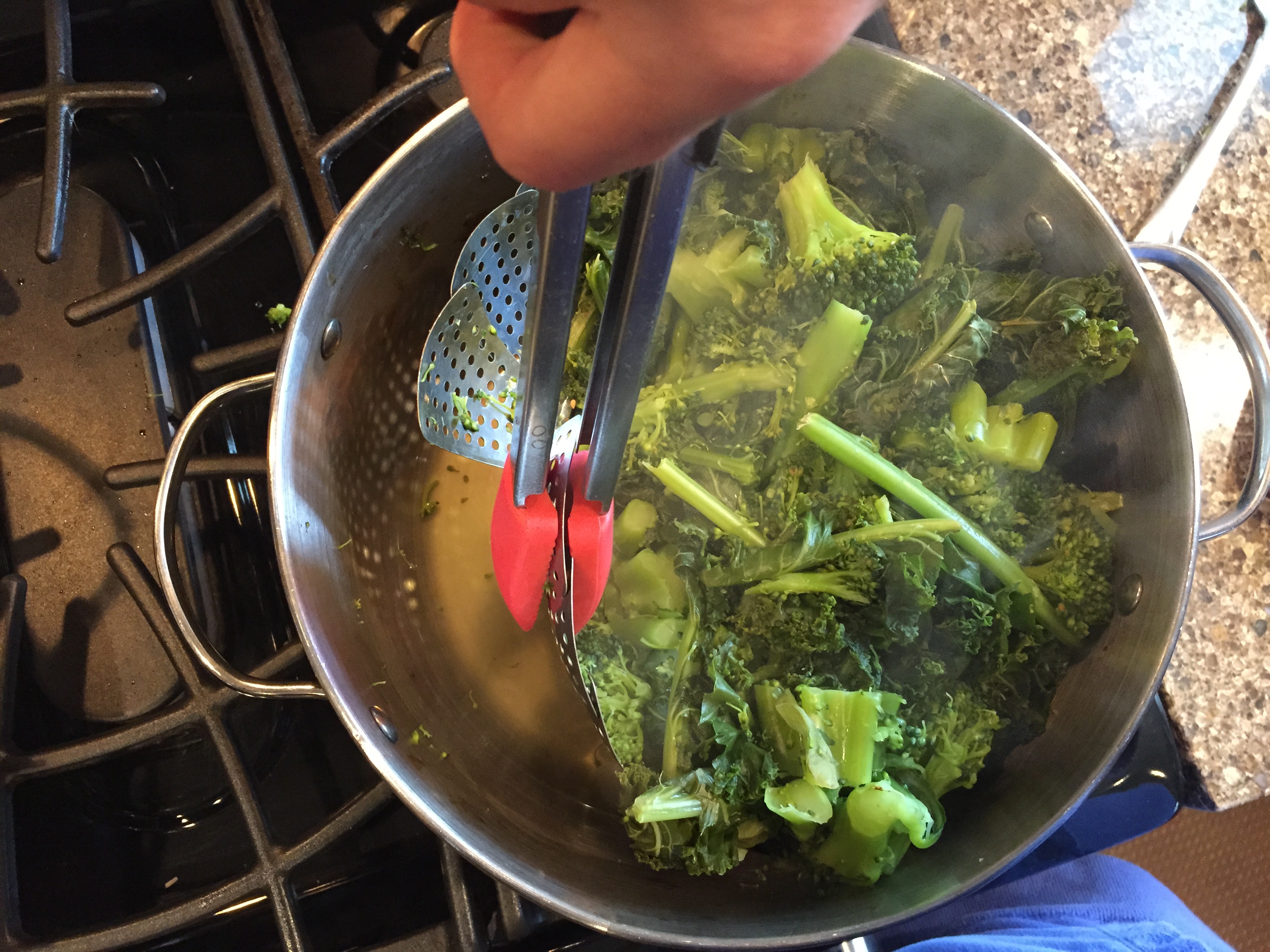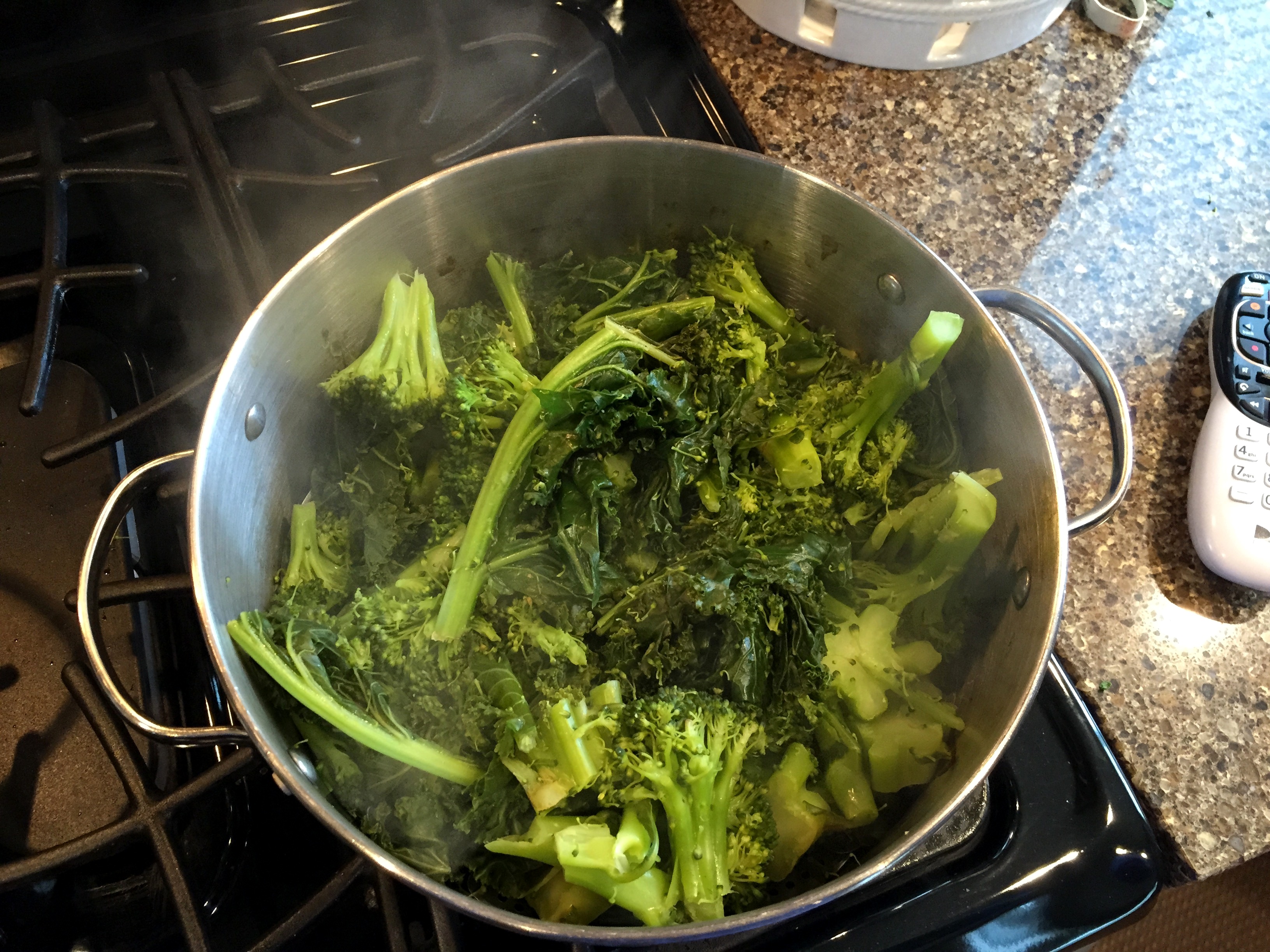 Add the broth and the Bragg’s seasoning into the onion pan and bring to a boil. Add to the broccoli and kale.