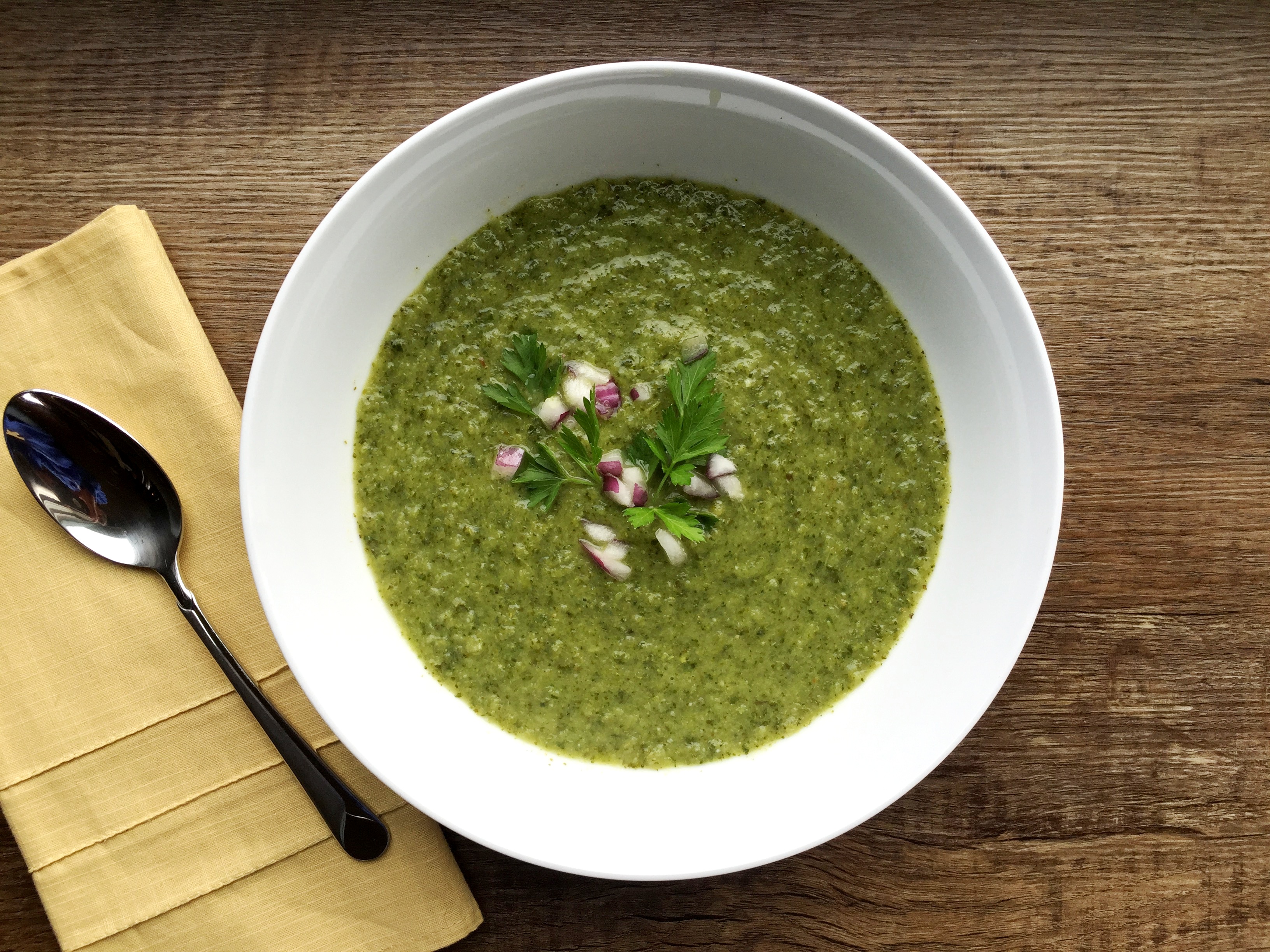 Make sure the soup is heated well and serve with a sprig of organic parsley and some diced organic red onion.