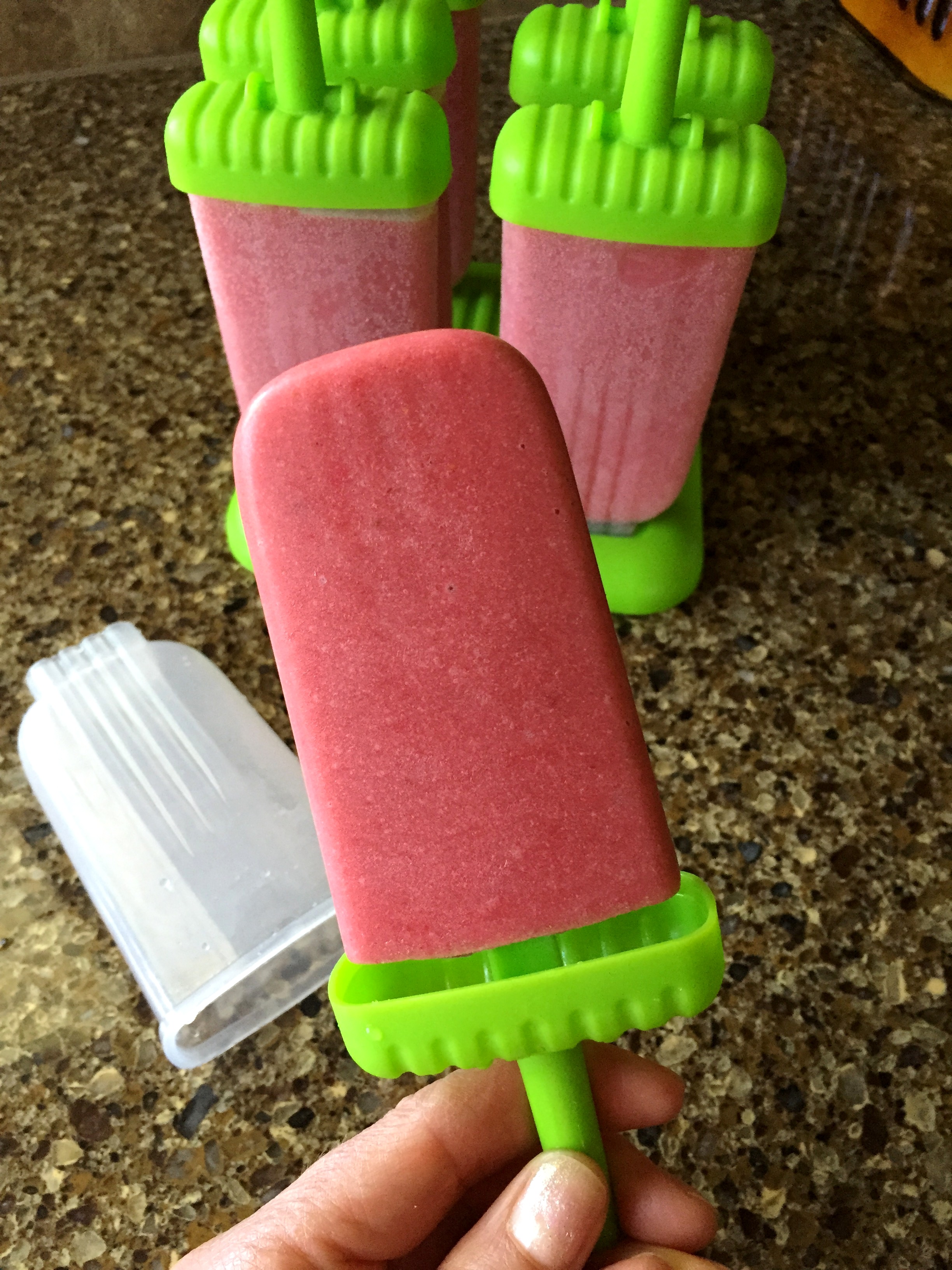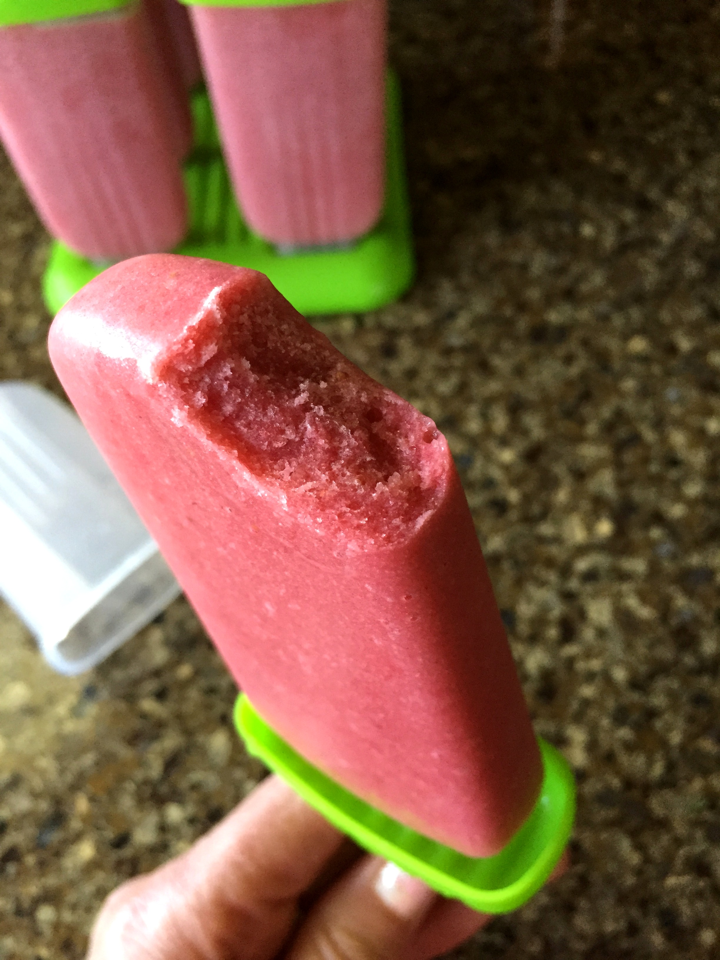 These Strawberry Yogurt Pops are an easy and healthy sweet treat. The only ingredients are coconut yogurt and fresh strawberries. Wash and slice your favorite fruit. Add the yogurt, whiz it up until smooth (or not smooth, whatever your preference) and fill your popsicle molds. Easy.