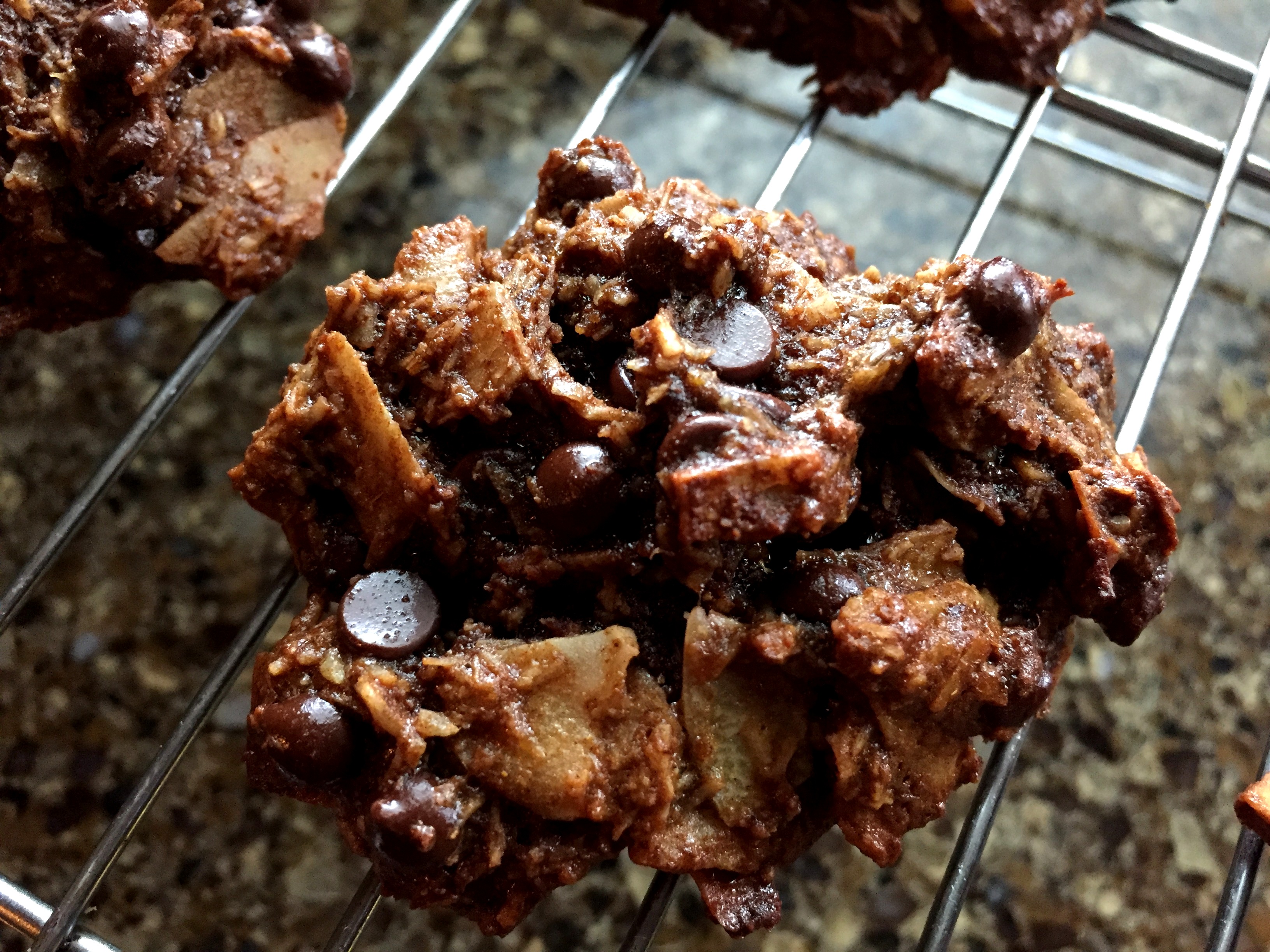 Mix all ingredients well in one bowl. Line a baking sheet with parchment paper and scoop out 15 heaping Tablespoons of the cookie dough. Bake for 16 minutes.