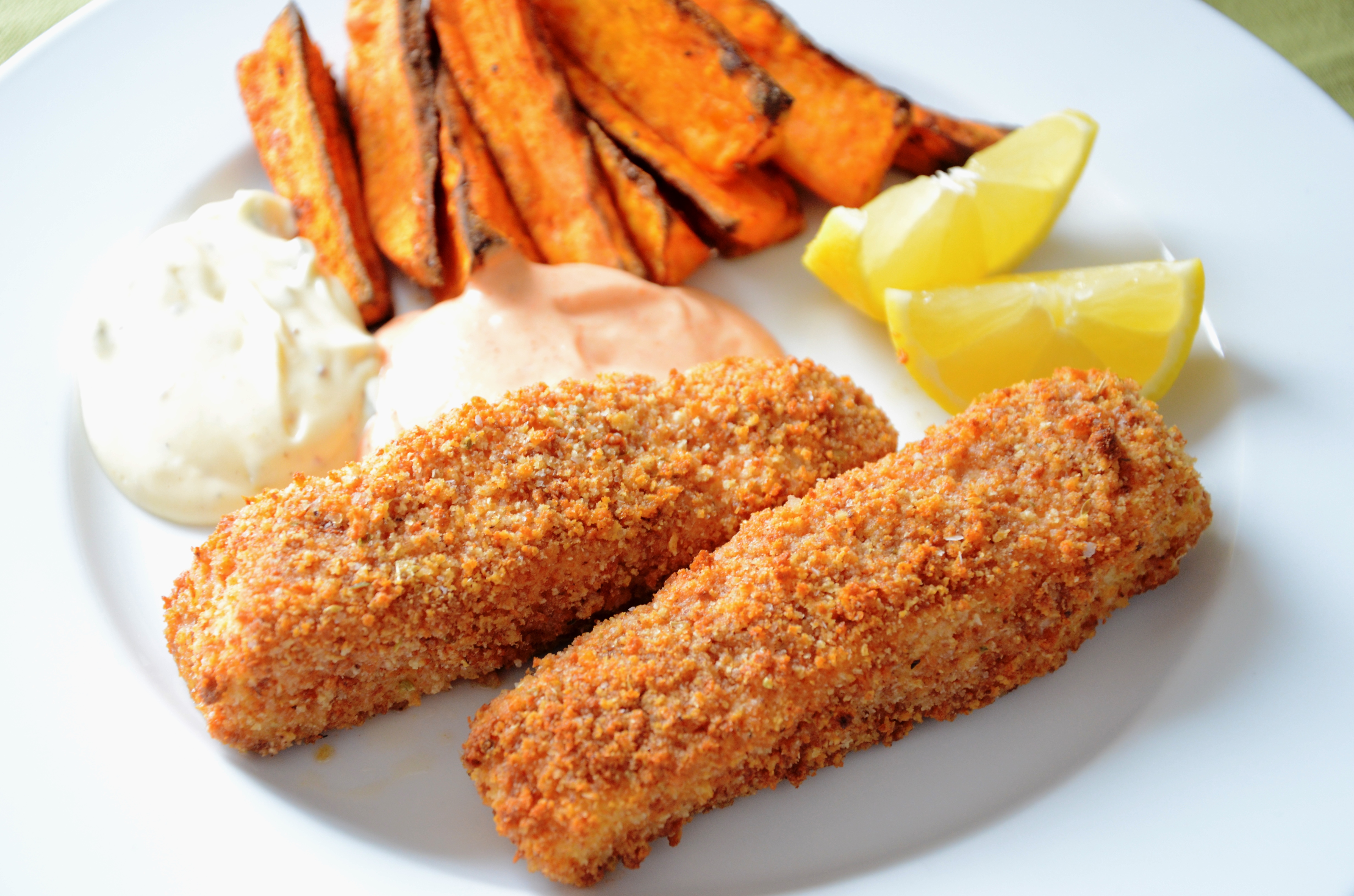 Serve with the sweet potato fries, lemon wedges, and a dollop of both dips.