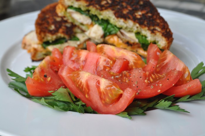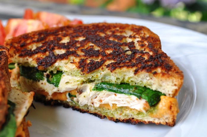 I’m sure you know how to make a grilled cheese so I will just give the basics. Grill the chicken first, or use leftovers, your preference. Spread pesto on the insides of both pieces of bread. Place the cheese on the bottom piece of bread, closest to the heat. Layer everything else however you like and cook until nice and toasty.