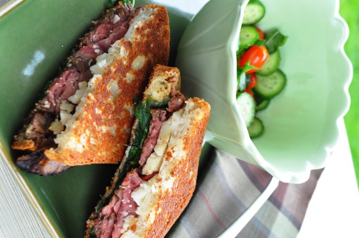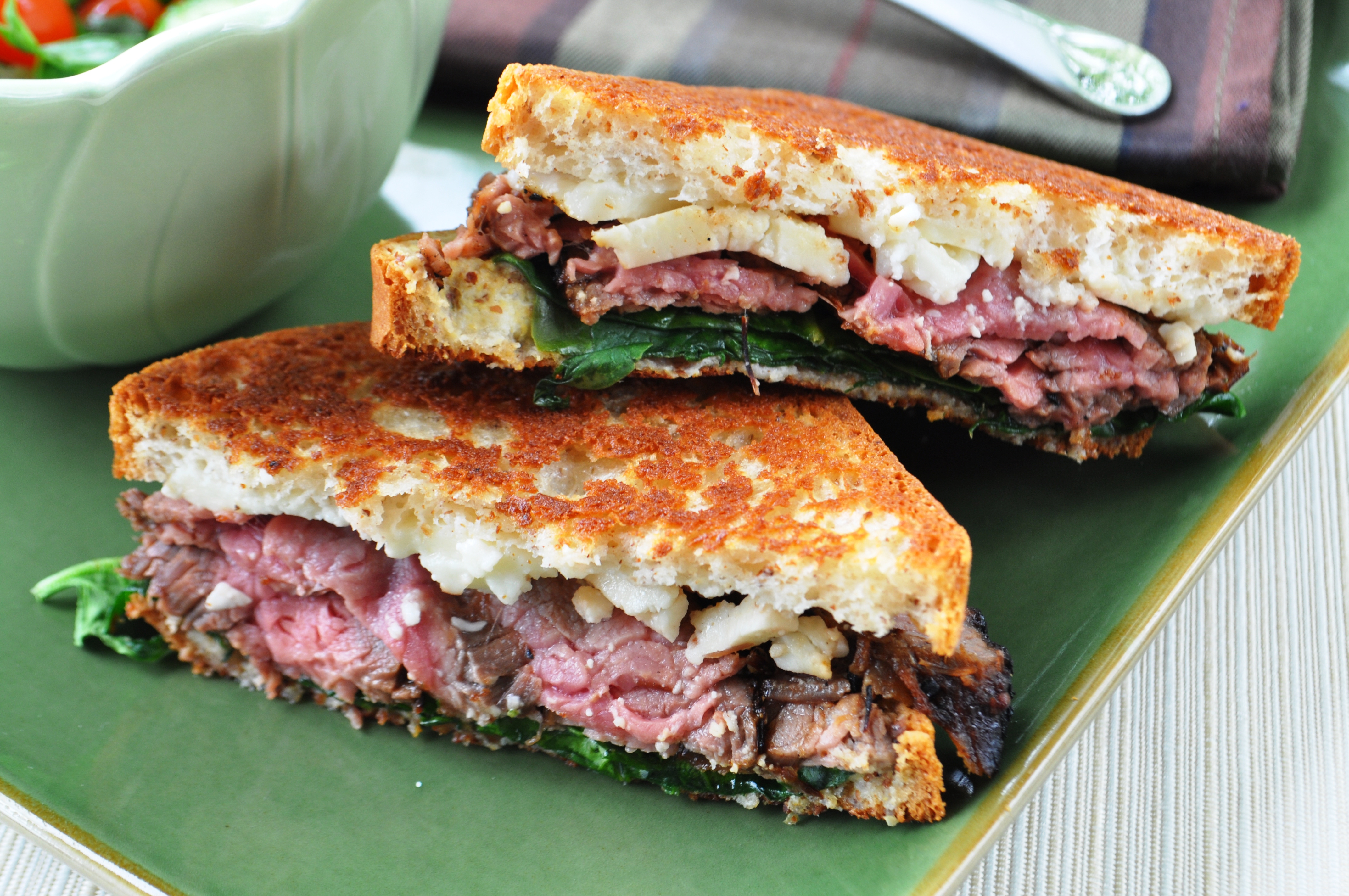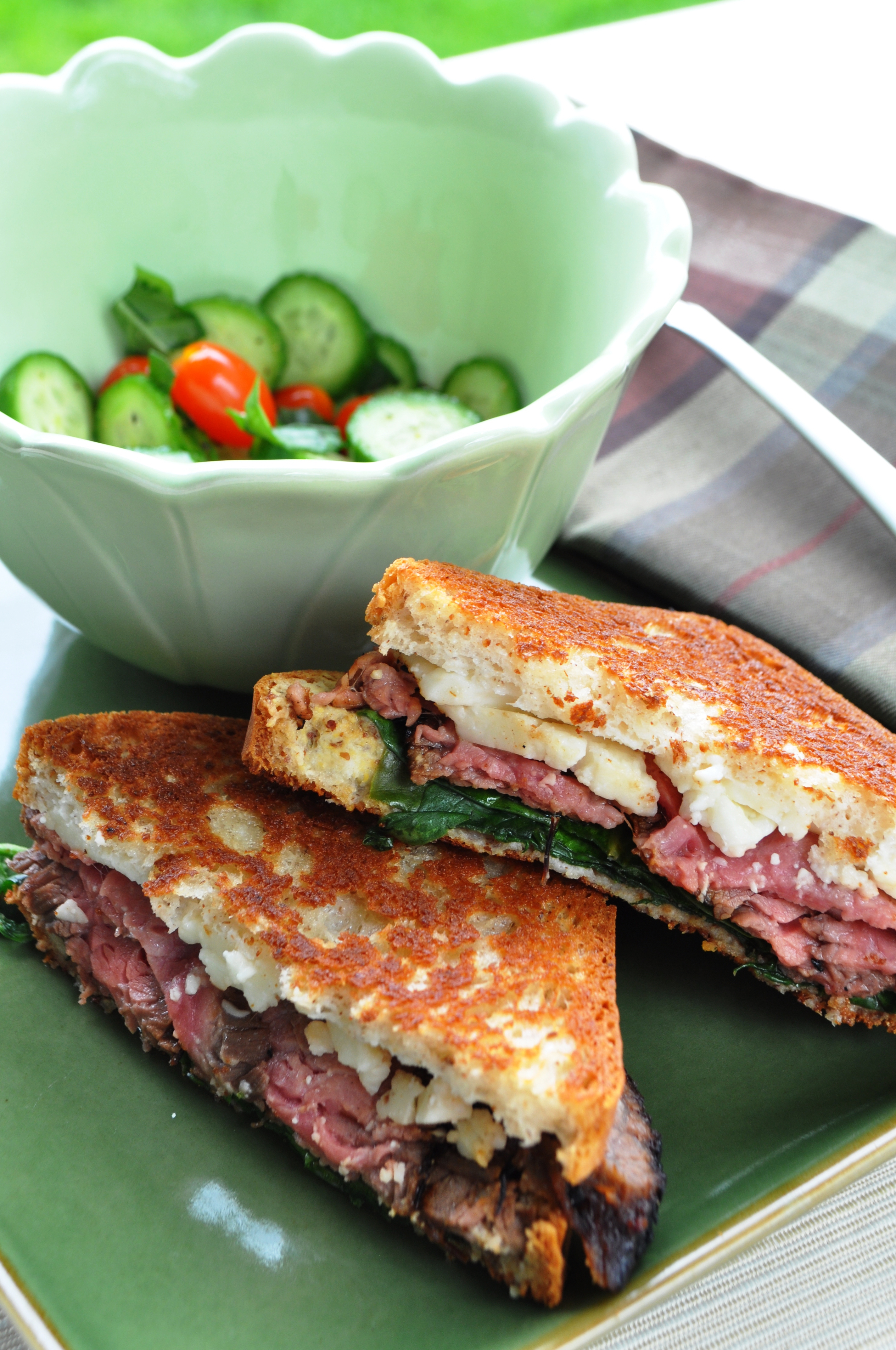 Butter one side of each slice of bread. Place one slice of bread butter side down in a small skillet. Layer cheese across the bread, top with very thinly sliced grilled flank steak, top with a generous amount of spinach leaves. Spread a generous layer of the mustard on the non-buttered side of the second piece of bread and place it mustard side down on top of the spinach.