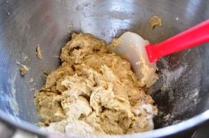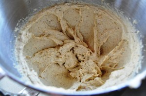 3. With the mixer on its lowest speed, slowly add the dry ingredients until combined. Stop the machine and scrape the bottom and sides of the bowl with a rubber spatula.